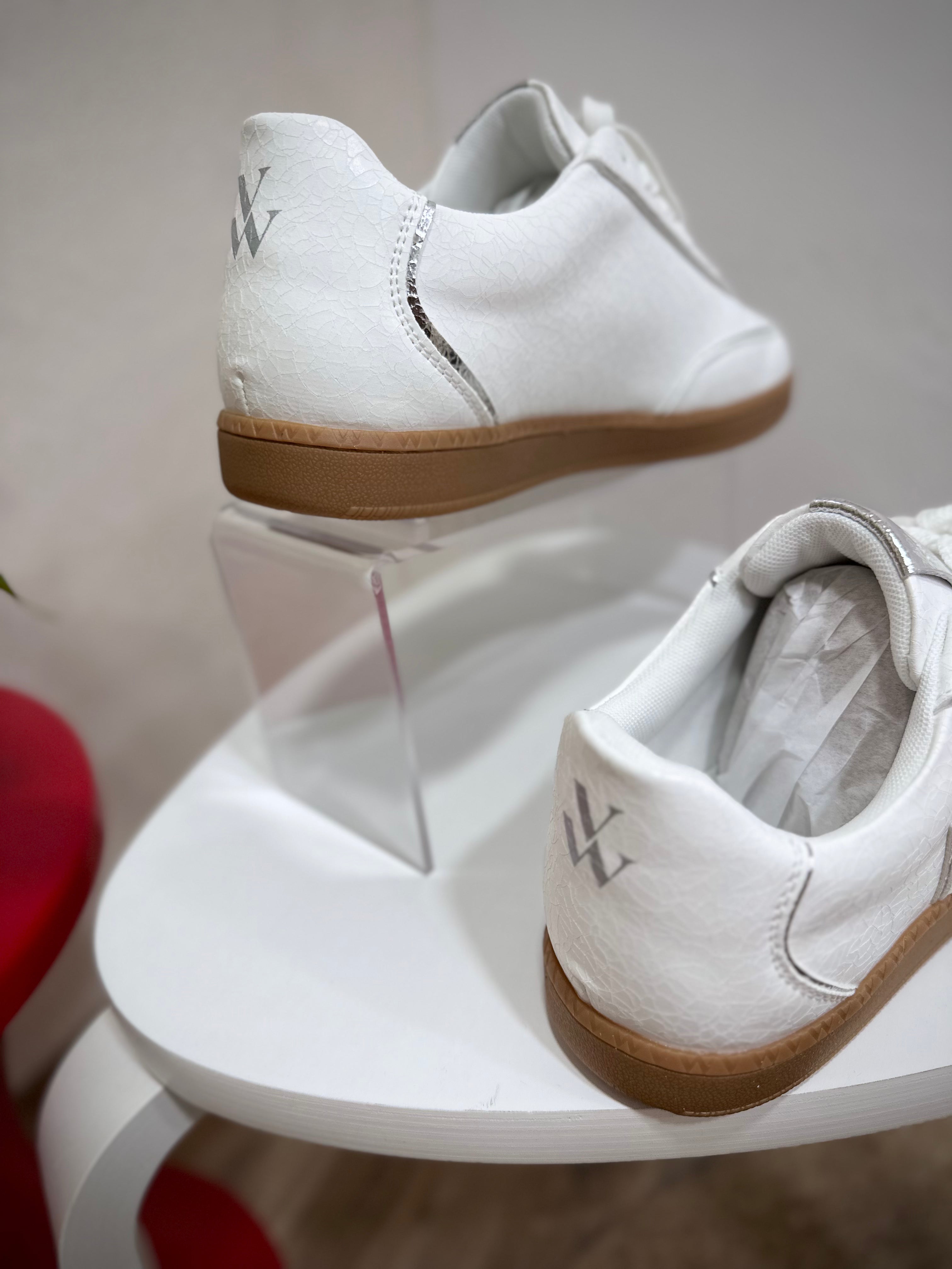 • Couleur : Blanc craquelé, détails argent, semelle camel