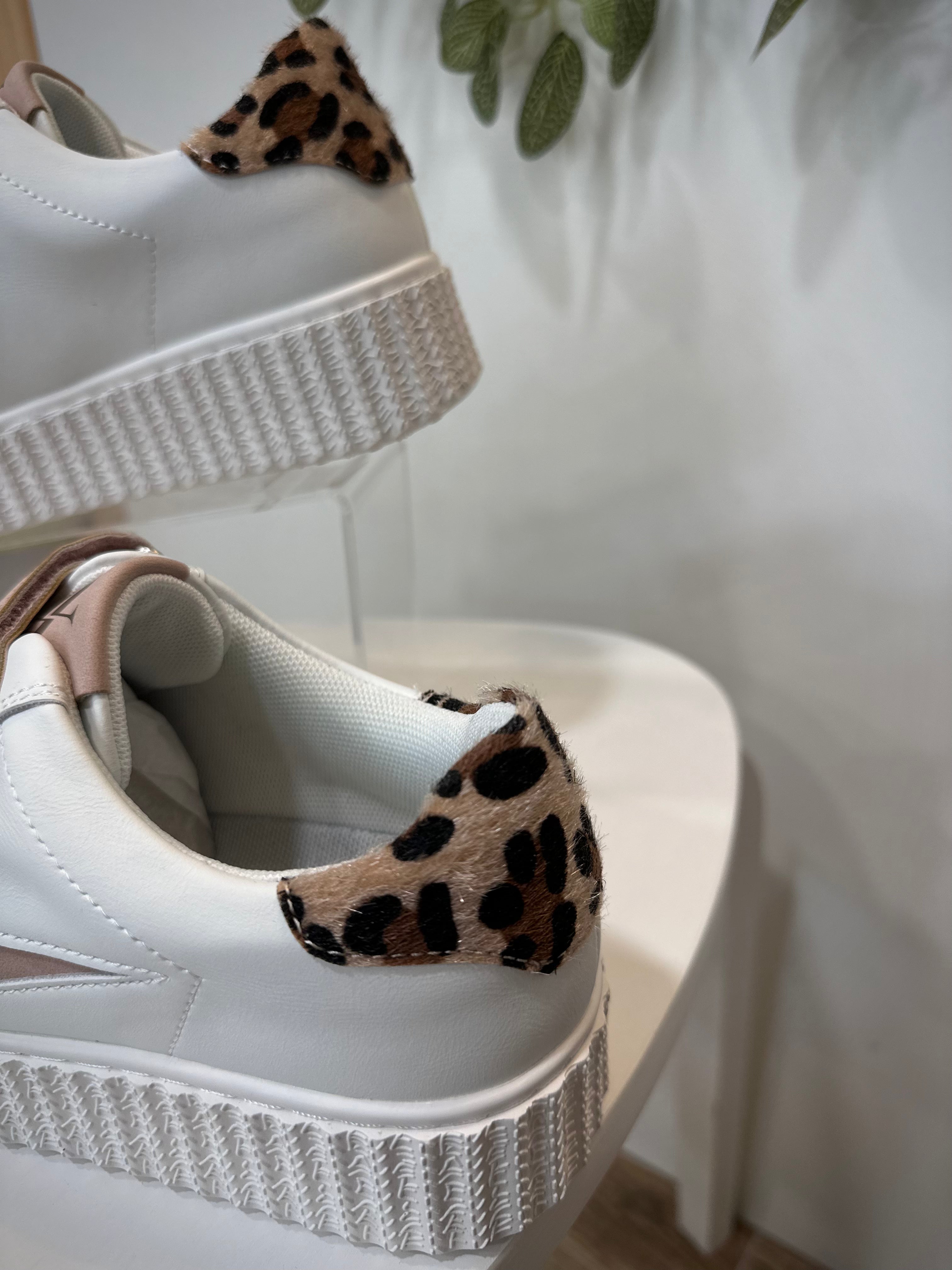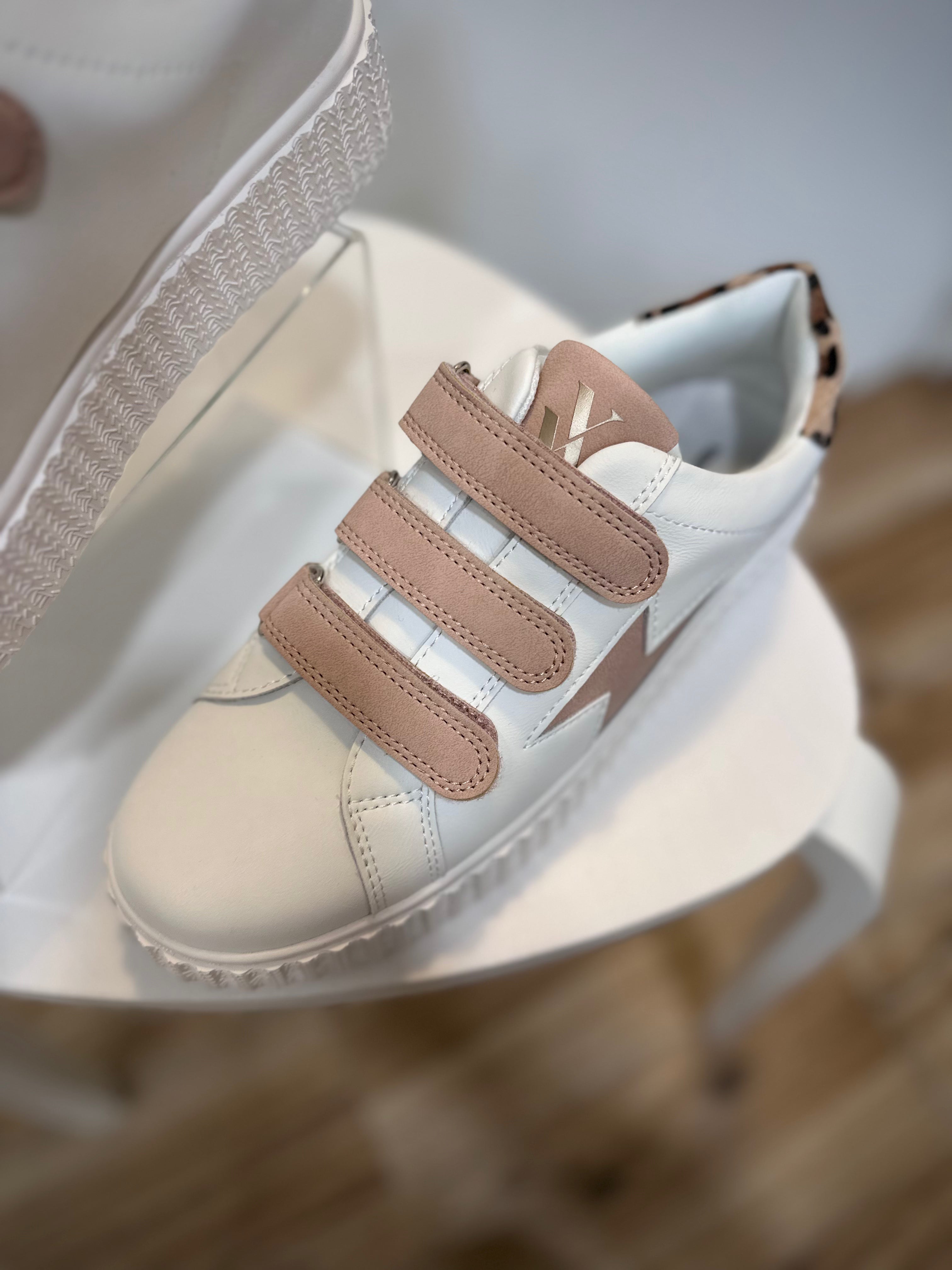 Conçues en similicuir blanc, ces sneakers se distinguent par une découpe en forme d’éclair en suédine effet peau de pêche rose poudré, ainsi qu’un patch arrière en tissu beige imprimé léopard effet poulain. La fermeture à scratchs ton sur ton apporte praticité et modernité. Leur bout rond et leur semelle creepers blanche de 4 cm, soutenue par une plateforme de 3,5 cm, garantissent confort et style. À l’intérieur, une semelle amovible à microbilles effet massant vous offre un bien-être à chaque pas.