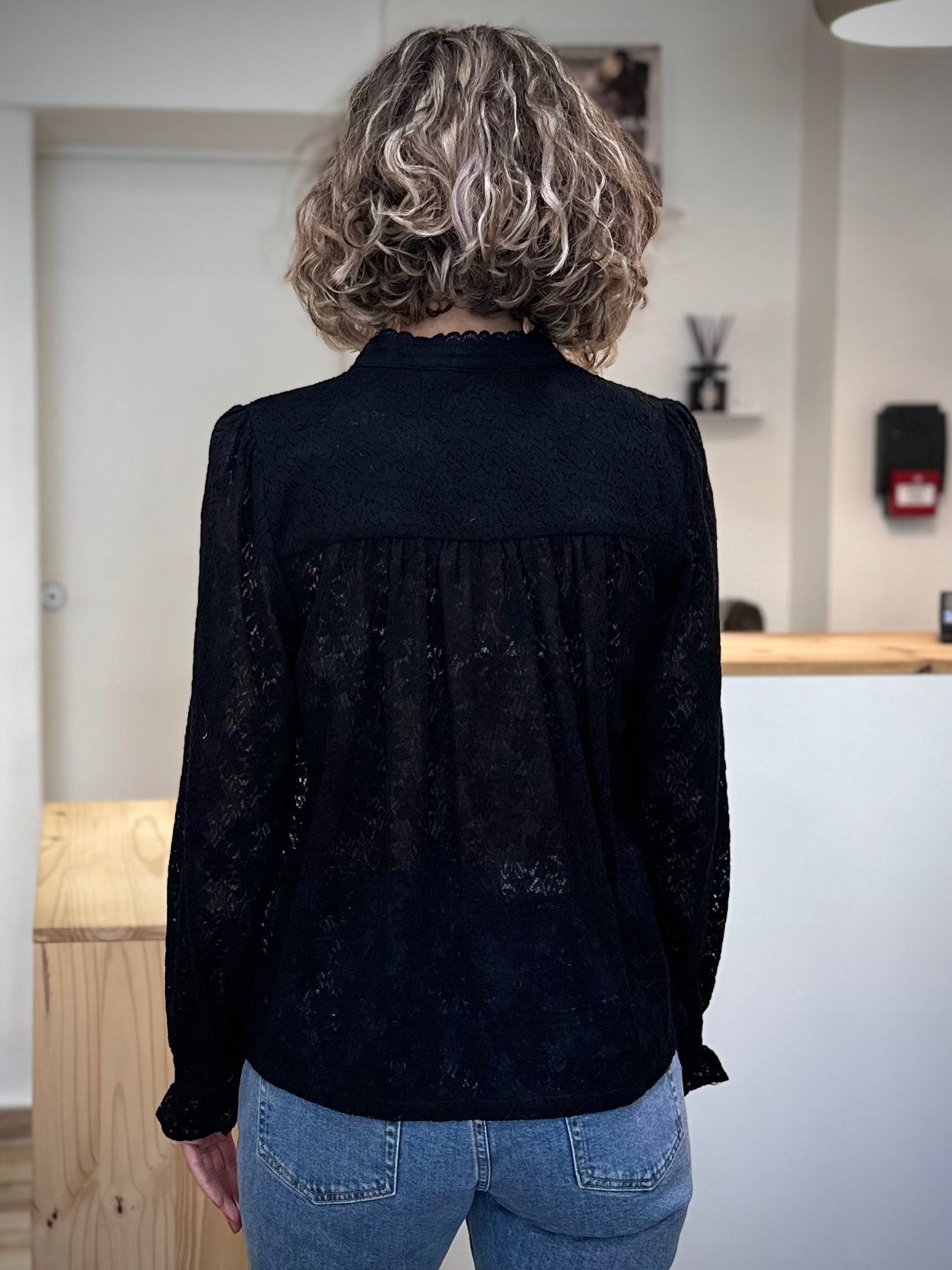Confectionnée dans une dentelle délicate mêlant coton, nylon et élasthanne, la blouse offre une coupe droite, confortable et flatteuse. Les manches longues boutonnées se terminent par de jolis poignets à volants, tandis que l’encolure ronde soulignée d’un galon de dentelle révèle un raffinement subtil. Les fronces aux épaules et au dos apportent une touche de volume et de douceur, rendant chaque mouvement fluide et élégant.