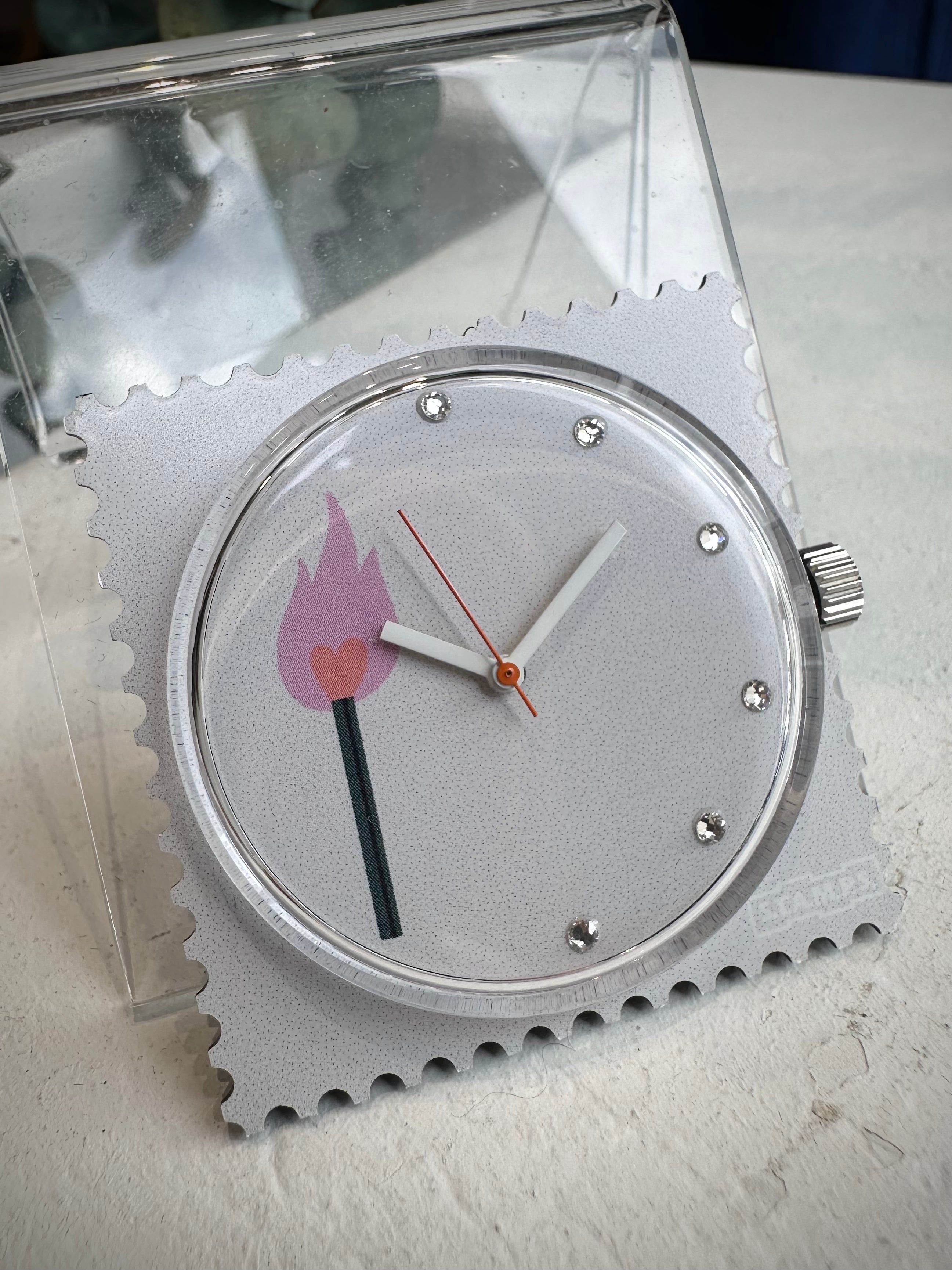 Le cadran STAMPS Diamond Flame séduit par son motif allumette rose sur fond blanc, rehaussé de cristaux de verre argentés étincelants. Élégant et audacieux, il devient un véritable accessoire mode, apportant lumière et originalité à vos tenues quotidiennes casual chic. Chaque regard porté sur votre poignet révélera un détail artistique et unique.