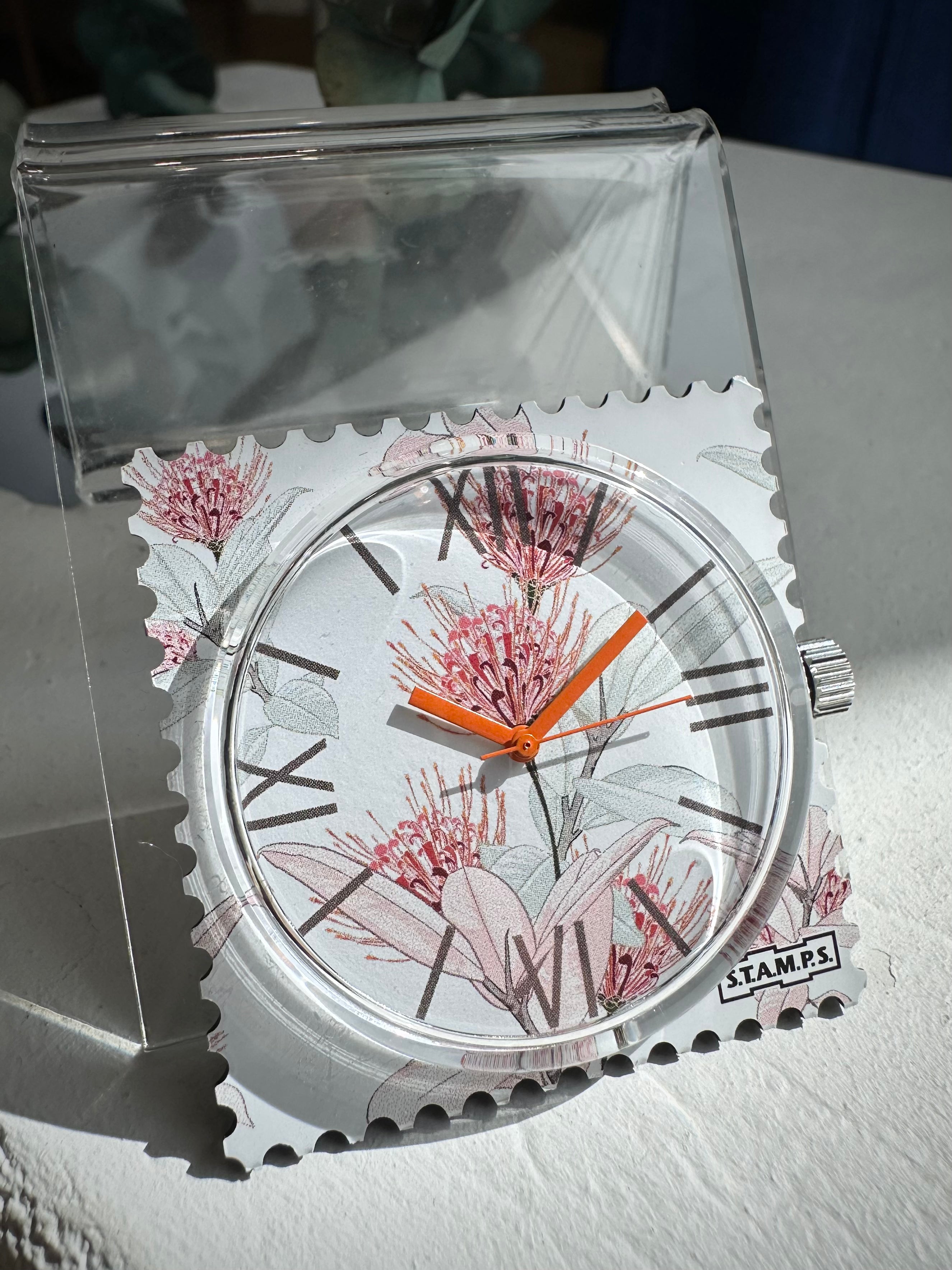 - Couleurs : fond blanc, fleurs pastel (rose, vert), aiguilles orange, trotteuse orange