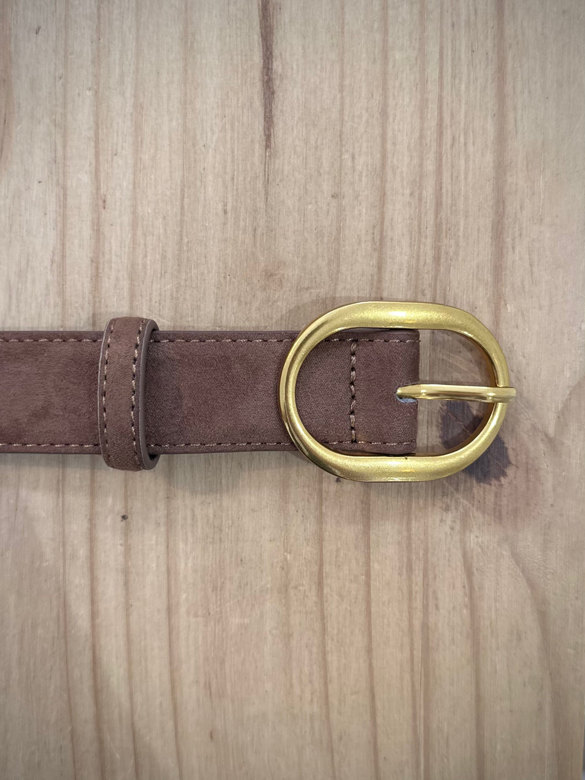 Confectionnée en suédine douce au toucher velouté, cette ceinture se distingue par sa boucle en métal doré au design raffiné. Sa largeur équilibrée et sa teinte châtaigne – profonde et automnale – lui donnent un charme aussi moderne que classique.