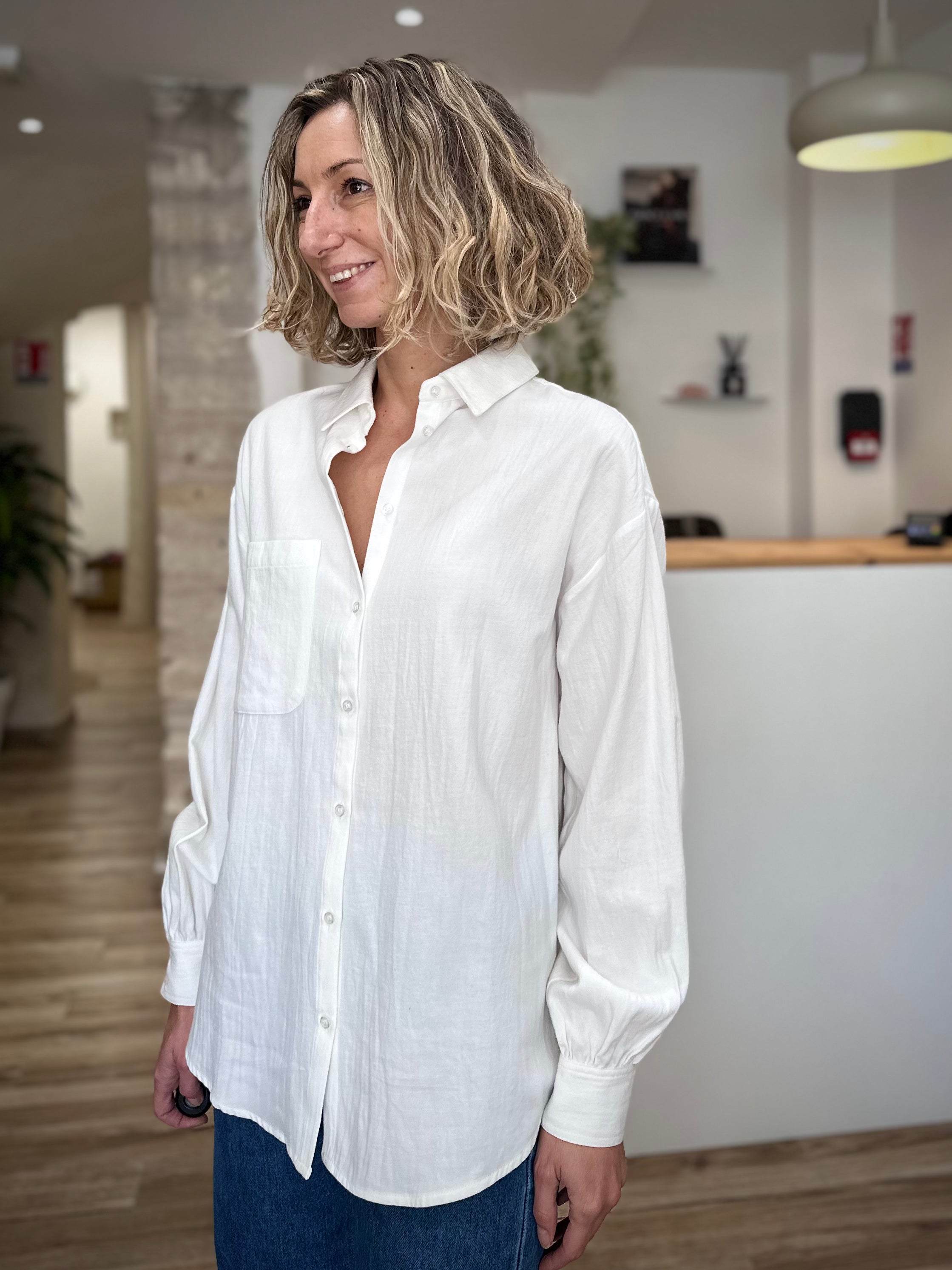 Confectionnée en coton 100% gratté, cette chemise combine douceur et confort. Sa coupe oversize avec épaules tombantes offre un tombé souple et décontracté, tandis que la forme liquette à la base apporte une touche de féminité subtile. La poche plaquée sur la poitrine et les poignets boutonnés avec fentes complètent le style avec finesse. Le tissage crêpé ultra doux garantit un confort exceptionnel et une tenue impeccable, sans transparence.