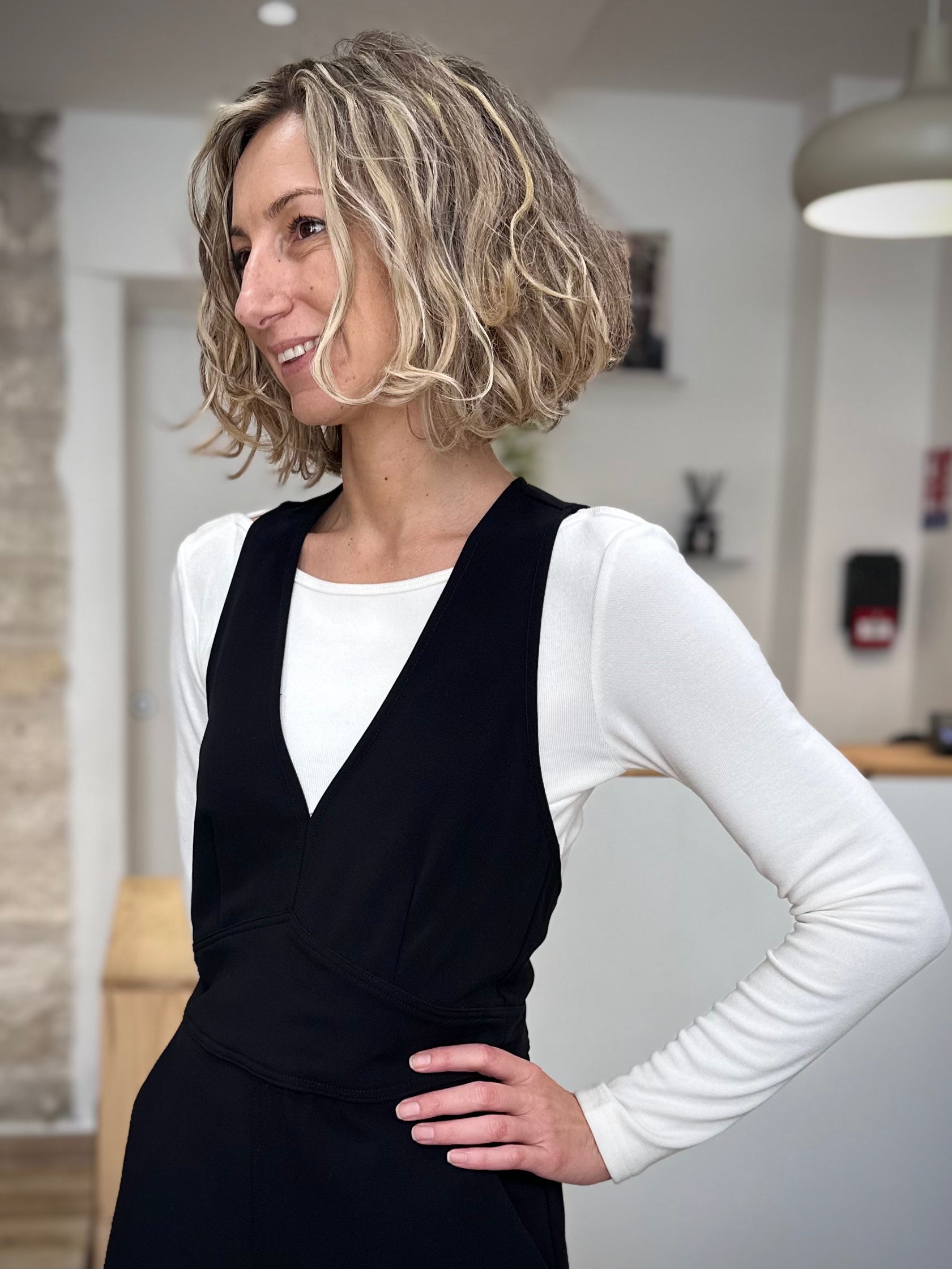 Pour le bureau ou les journées décontractées, on l’associe à un tee-shirt blanc en dessous et une paire de baskets pour une allure chic et cool. En soirée, il suffit d’ajouter des talons et quelques bijoux dorés pour la transformer en tenue élégante. Sa couleur noire profonde en fait une base parfaite, à accessoiriser selon votre humeur et les saisons.