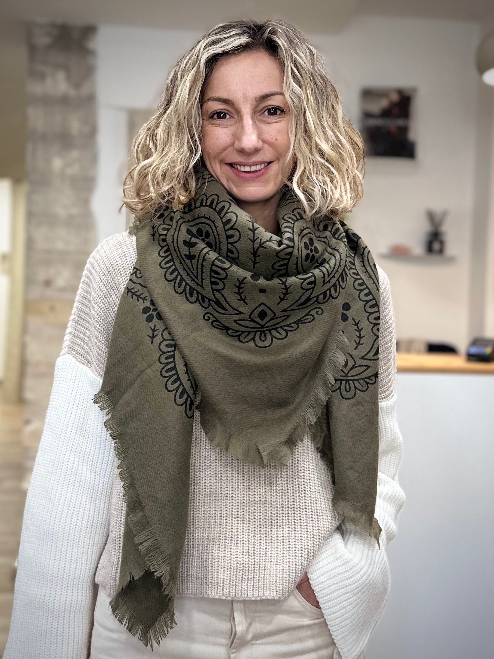 Avec ses nuances végétales et profondes, l’écharpe Bandana Alma kaki apporte une élégance naturelle et un charme discret à chacune de vos tenues. Son fond kaki, relevé de motifs bandana noirs au graphisme épuré, crée un contraste subtil et moderne qui évoque les promenades en forêt, les atmosphères urbaines adoucies, les silhouettes qui aiment les couleurs terre et le style affirmé sans effort.