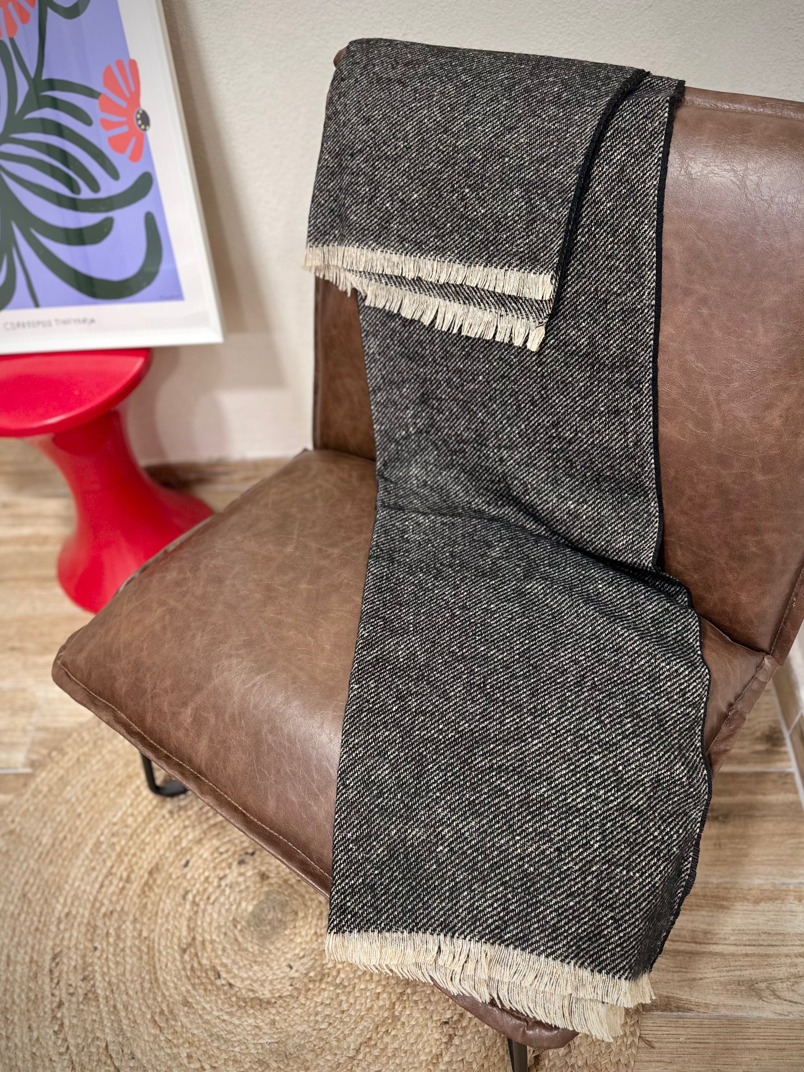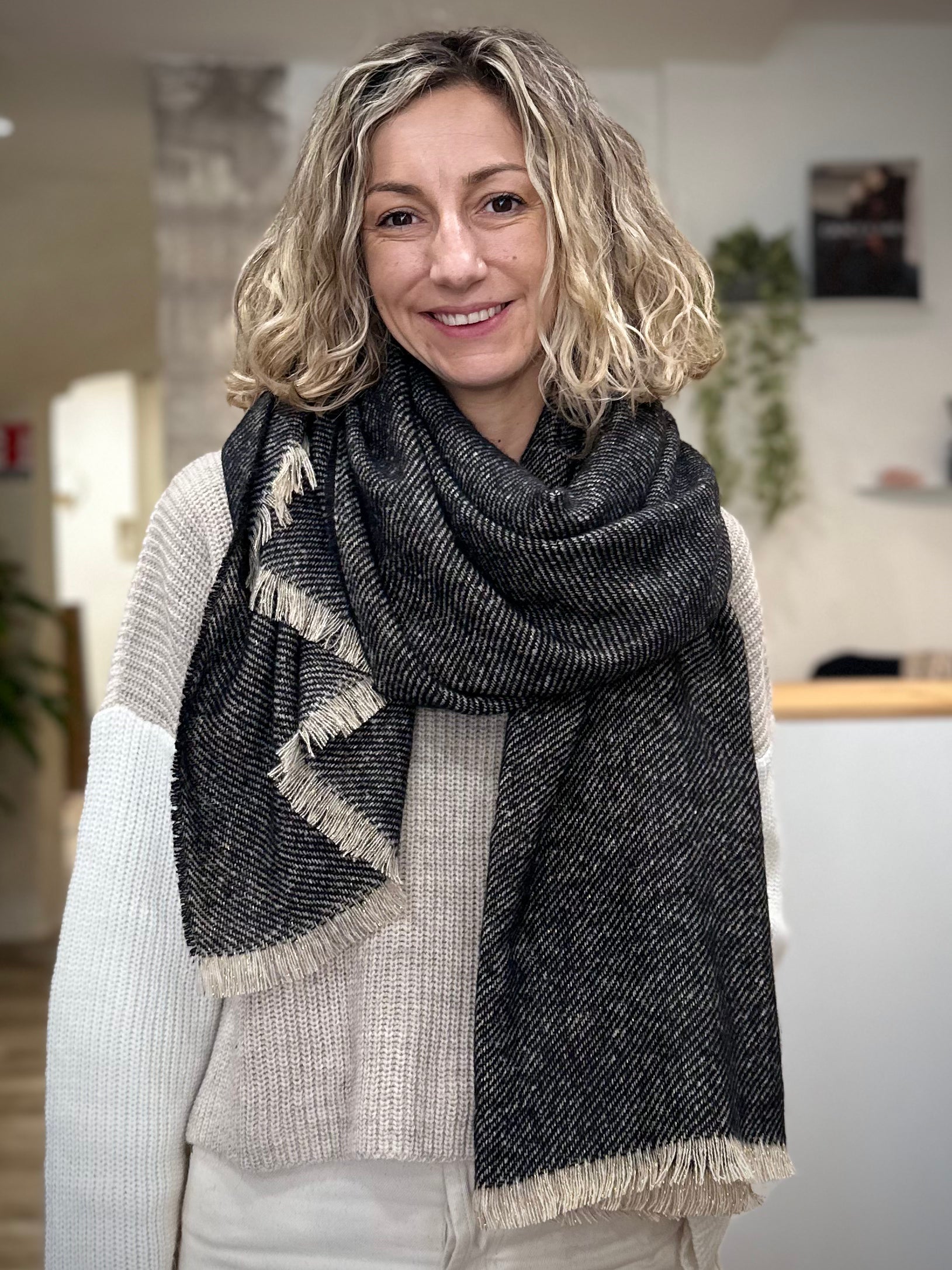 Quand les journées se rafraîchissent et que l’air se teinte de douceur, Mira devient ce geste réconfortant que l’on enroule autour de soi. Son noir profond, délicatement parcouru d’un fil doré, joue avec la lumière comme un éclat discret dans la nuit. Une écharpe inspirée par les soirées d’hiver, pensée pour offrir chaleur, élégance et une touche de poésie au quotidien.