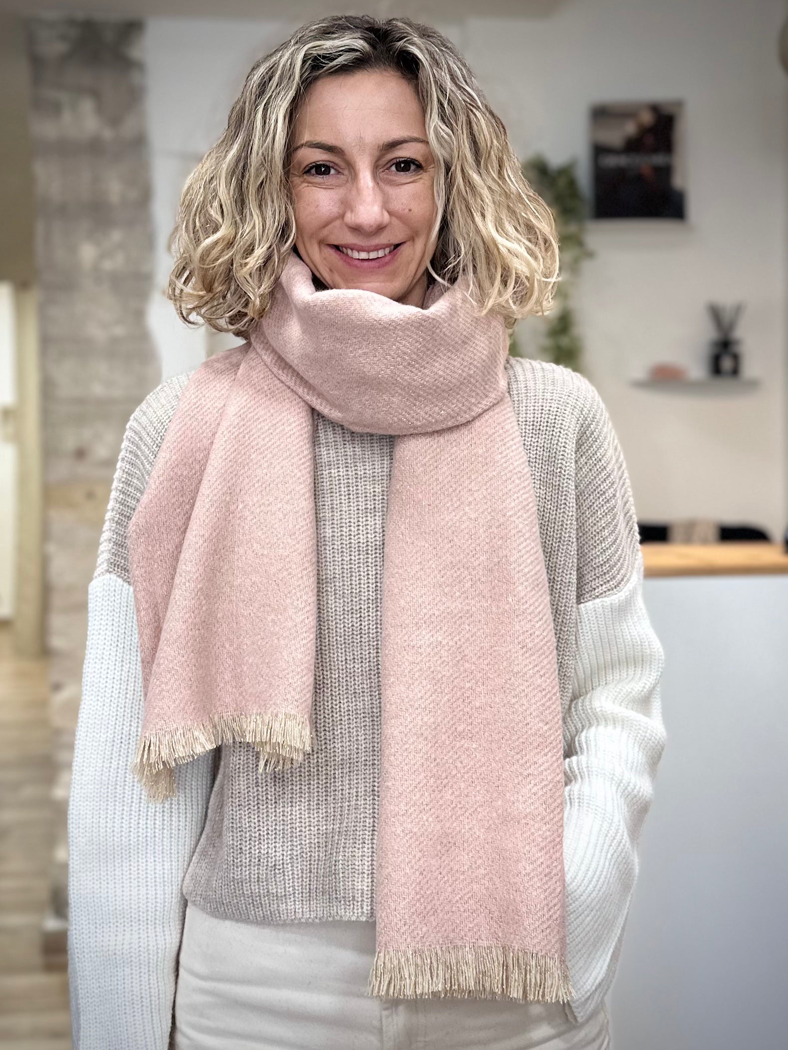 Sous les premiers rayons doux de l’hiver ou au crépuscule des soirées fraîches, Mira Rose apporte une touche de délicatesse et de lumière. Son rose pastel tendre, parsemé de reflets dorés subtils, évoque la douceur des fleurs hivernales et la chaleur rassurante d’un accessoire pensé pour choyer vos journées. Une écharpe qui enveloppe avec élégance et illumine chaque geste.