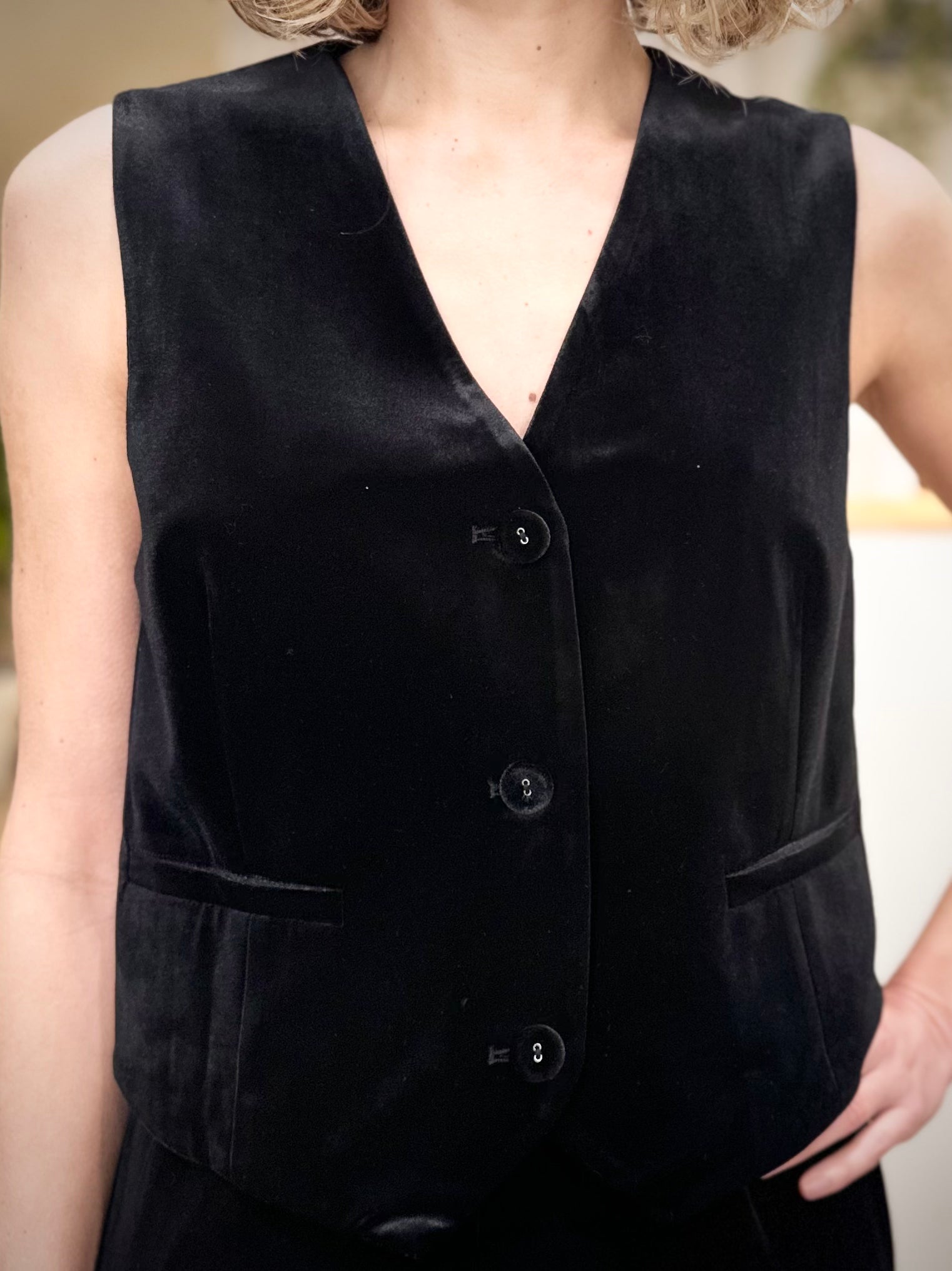 Quand l’hiver invite à superposer les matières et à jouer avec les silhouettes, le gilet TOTEM s’impose comme une pièce forte au charme intemporel. On l’imagine parfaitement glissé sur une blouse fluide ou porté à même la peau pour une allure plus audacieuse lors des soirées de fêtes. Avec son velours profond et ses lignes empruntées au vestiaire tailleur, il incarne cette élégance androgyne résolument moderne, typique de l’esprit Solaire.