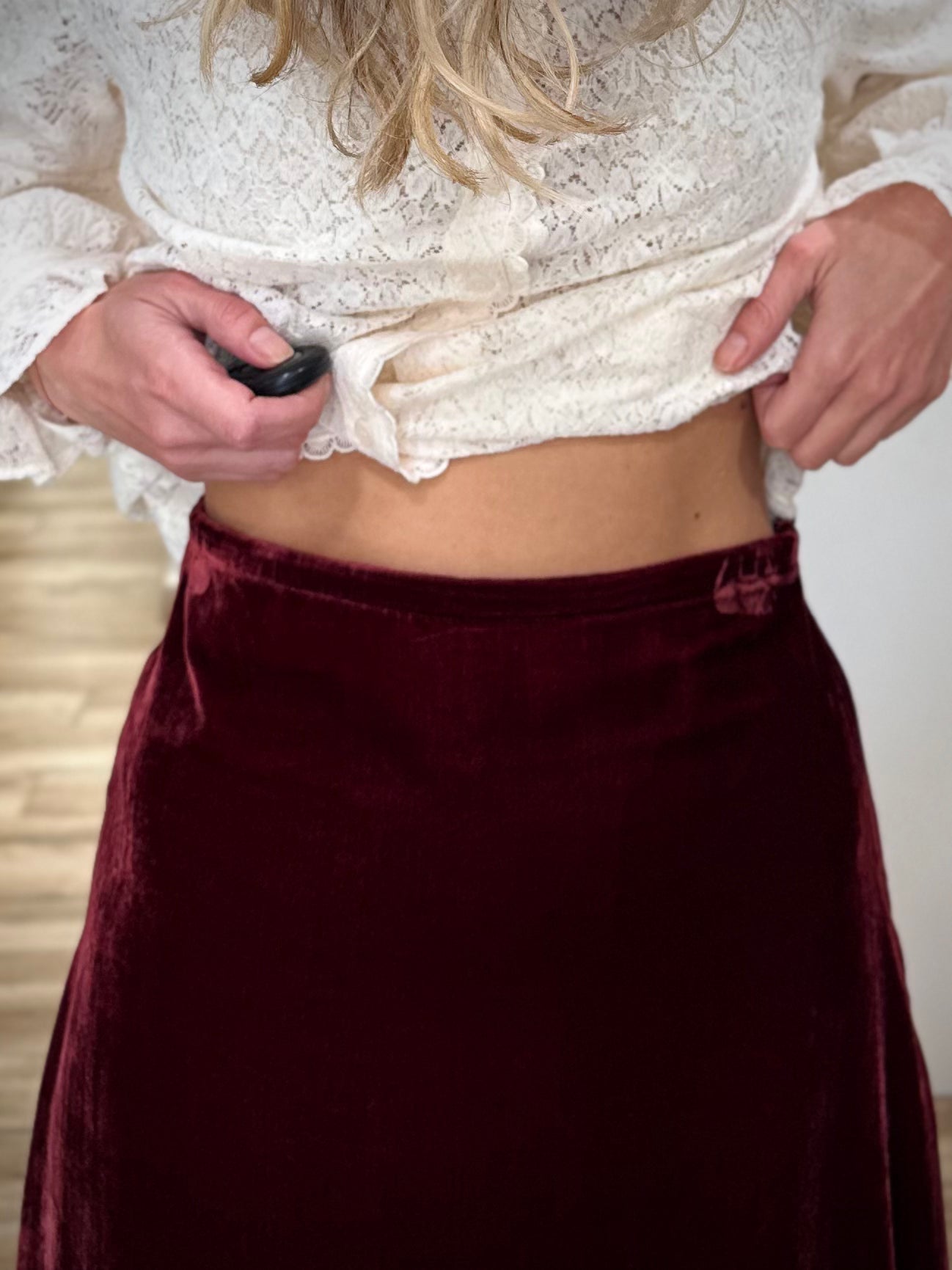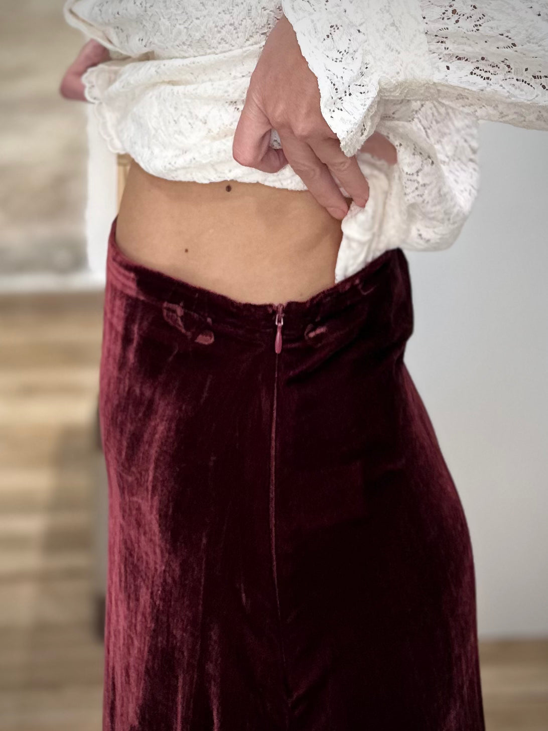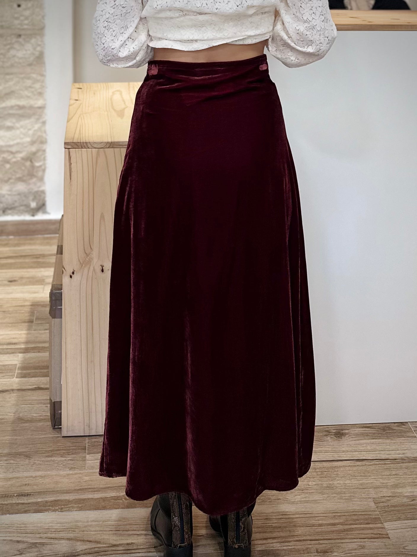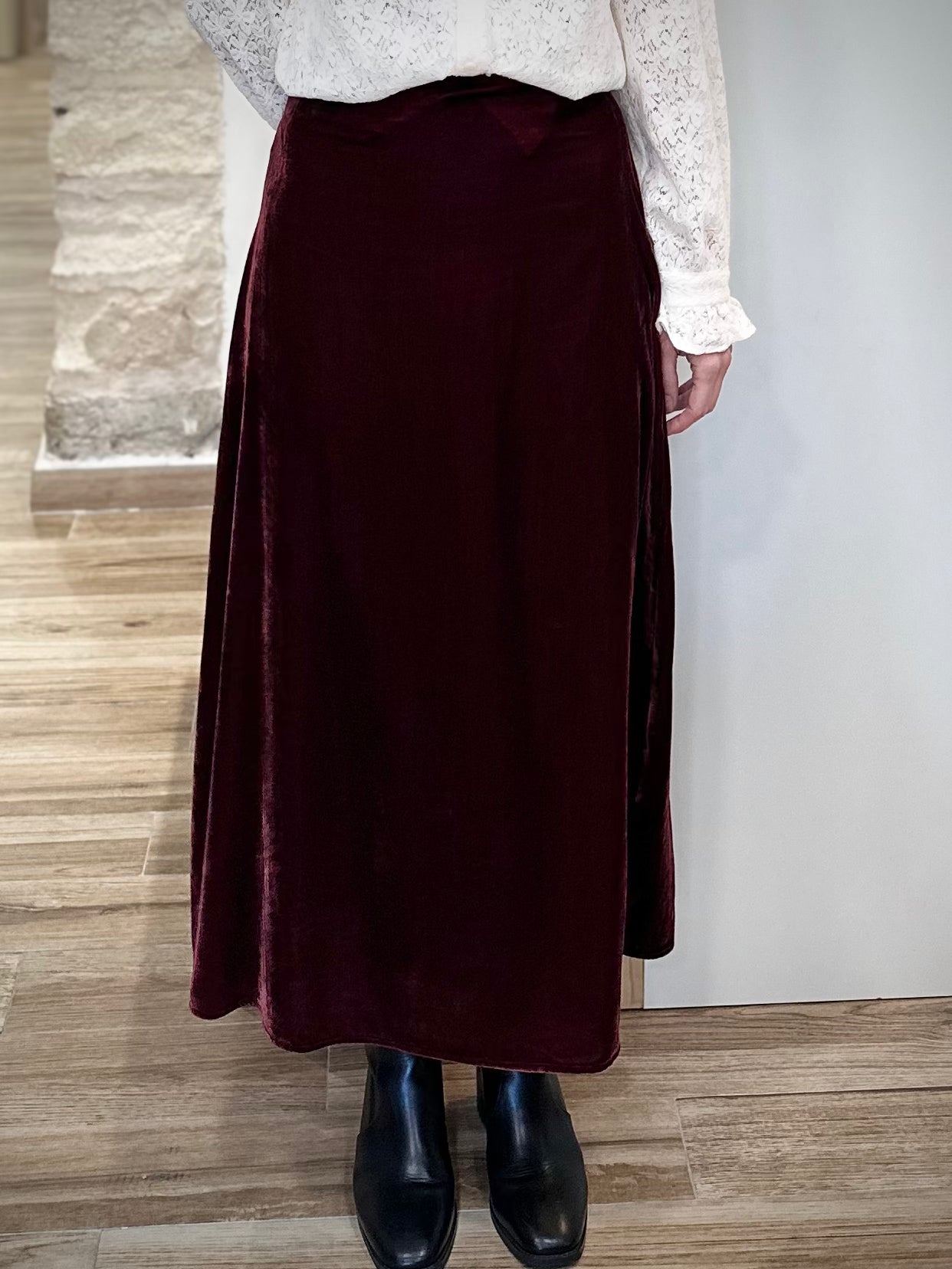 Conçue dans un velours dense et soyeux, cette jupe midi offre un mouvement fluide et léger tout en structurant délicatement la silhouette. Sa taille haute souligne la taille avec élégance, tandis que le zip invisible sur le côté préserve une ligne épurée et raffinée. Disponible dans un bordeaux profond qui capte la lumière, elle se marie à merveille avec des sweats oversize, des pulls en maille ou des chemisiers délicats.