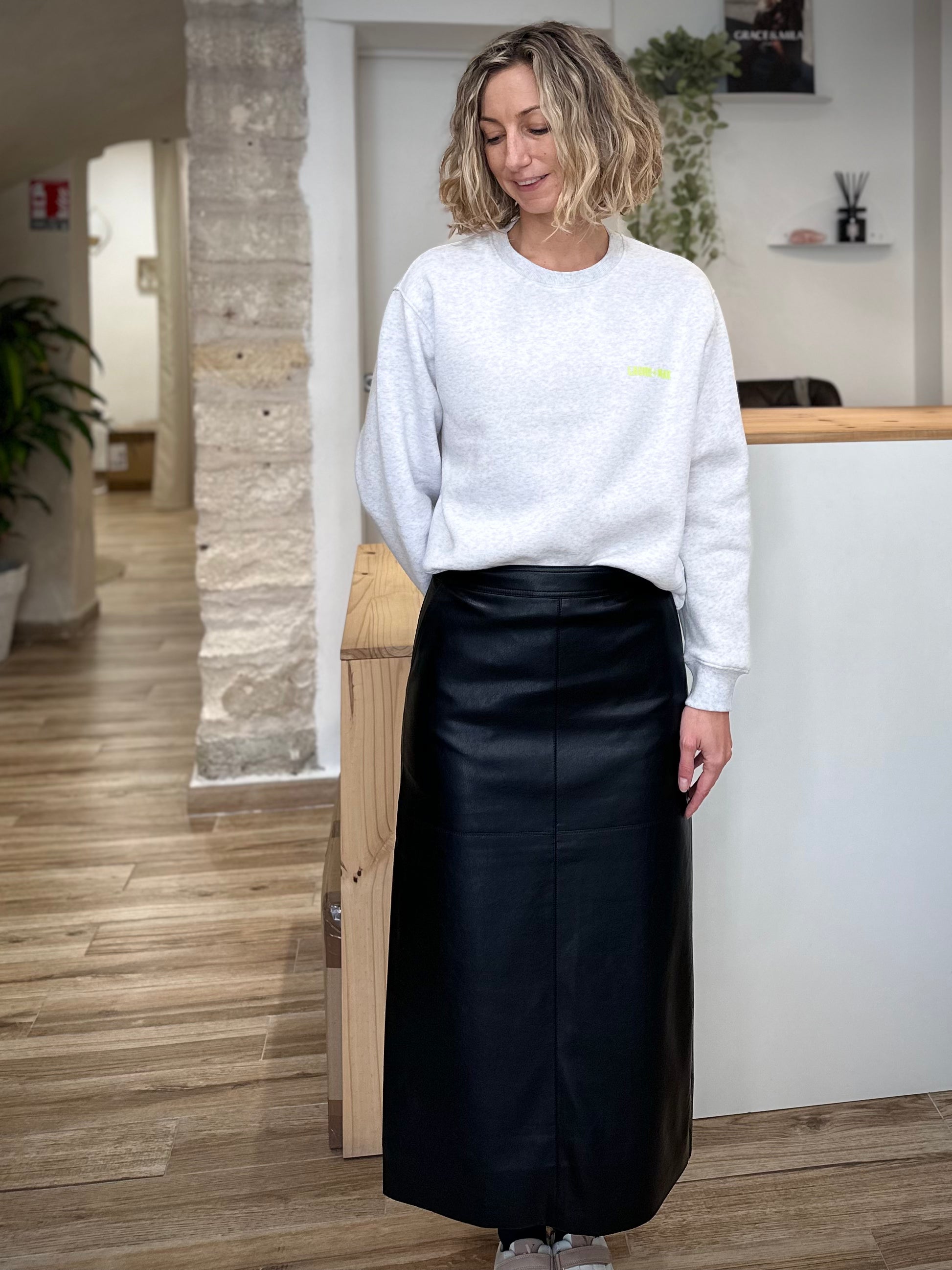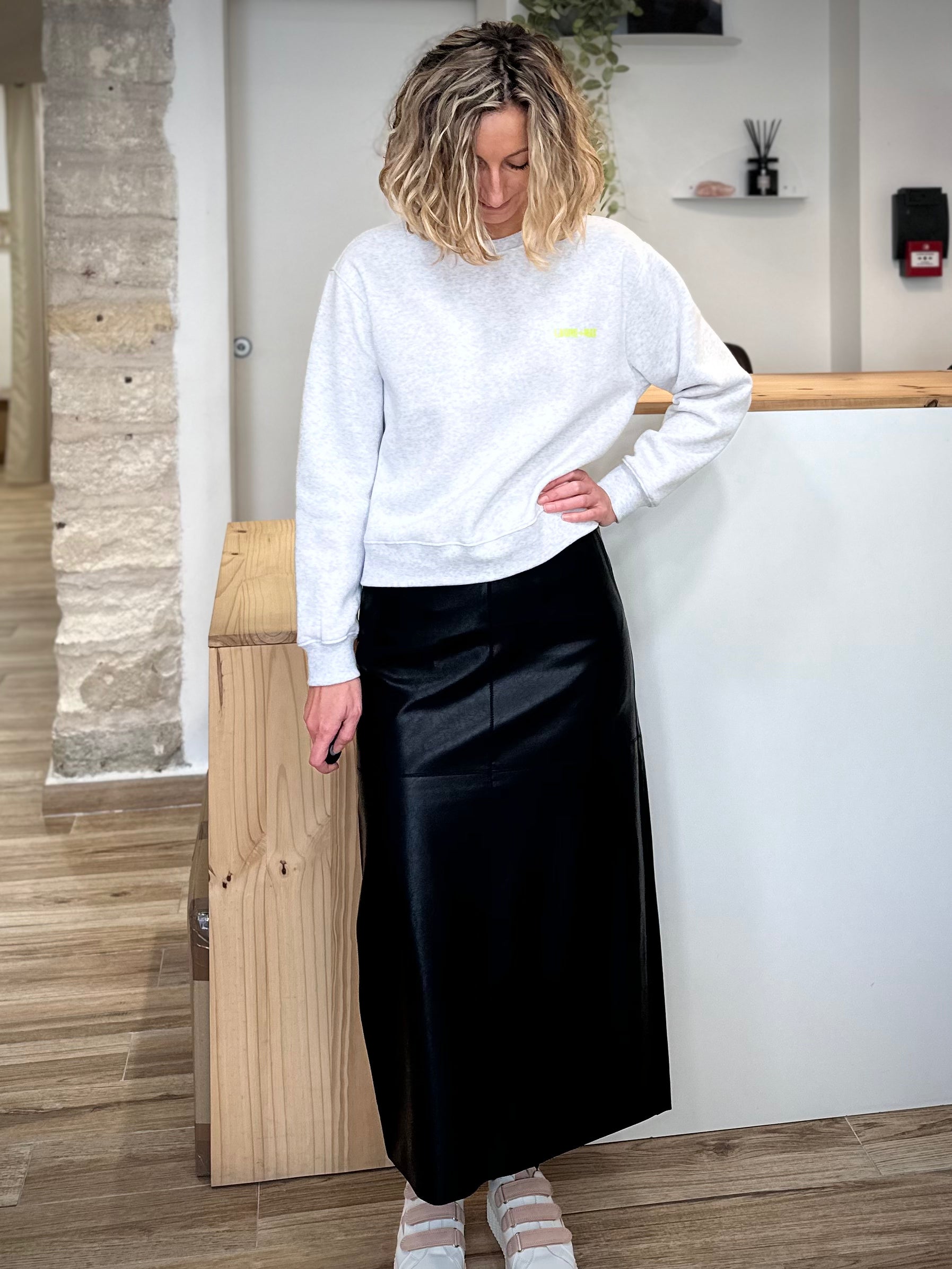 La jupe SIRENE en simili cuir noir capture l’essence d’une élégance moderne et décontractée. Avec son tombé fluide et sa texture douce au toucher, elle évoque ces tenues qu’on enfile sans hésiter, celles qui donnent immédiatement confiance. Son noir profond et son fini mat lui confèrent une allure sophistiquée, sans brillance excessive — juste ce qu’il faut de caractère pour sublimer la silhouette.