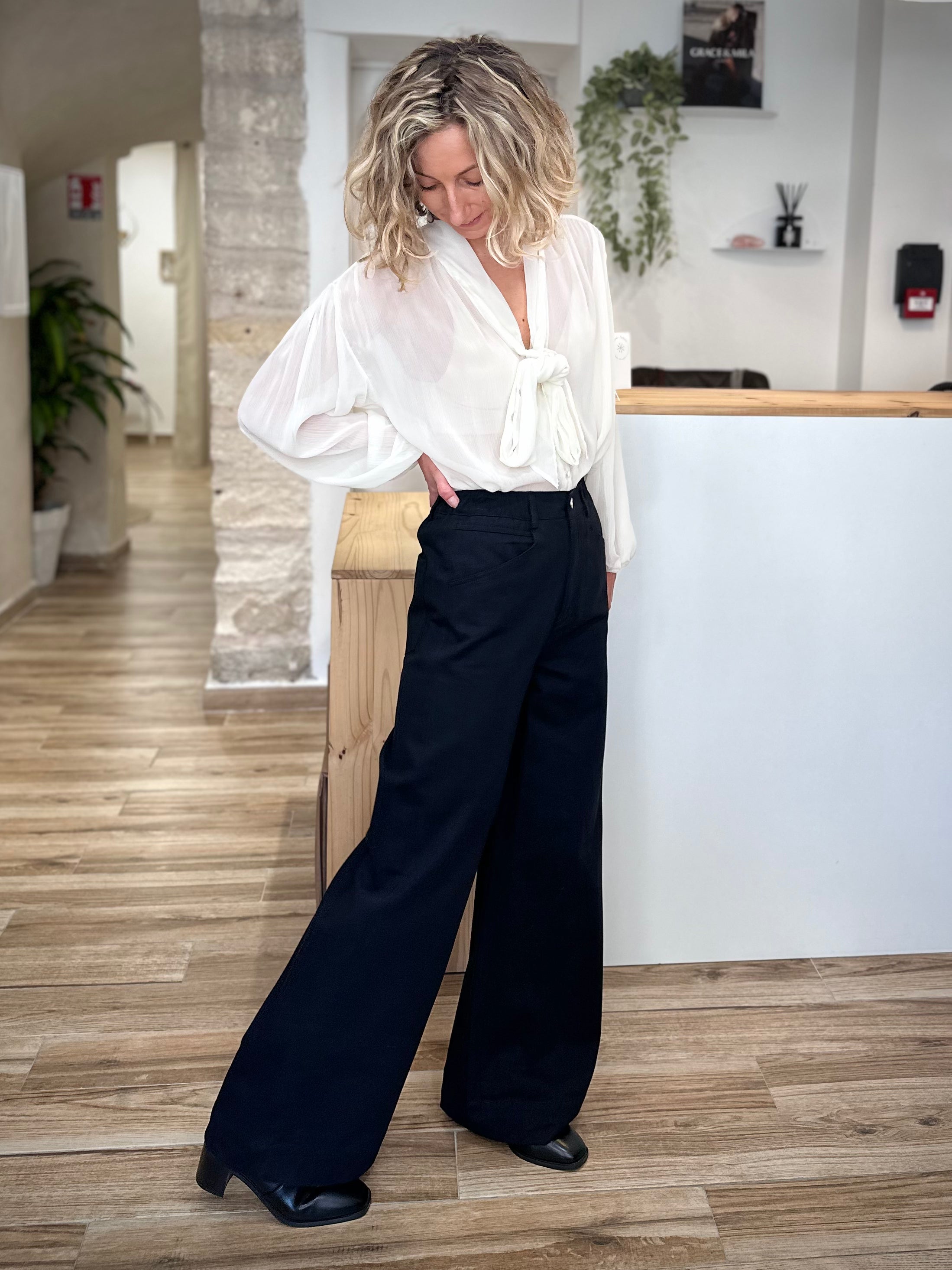 De jour comme de nuit, le pantalon Palmire noir s’adapte à votre rythme. Portez-le avec une chemise blanche légèrement oversize pour un look minimaliste, ou avec un top près du corps et des bijoux dorés pour une allure plus citadine. Sa coupe fluide et sa couleur sobre en font un indispensable du vestiaire féminin : le parfait équilibre entre décontraction et élégance.