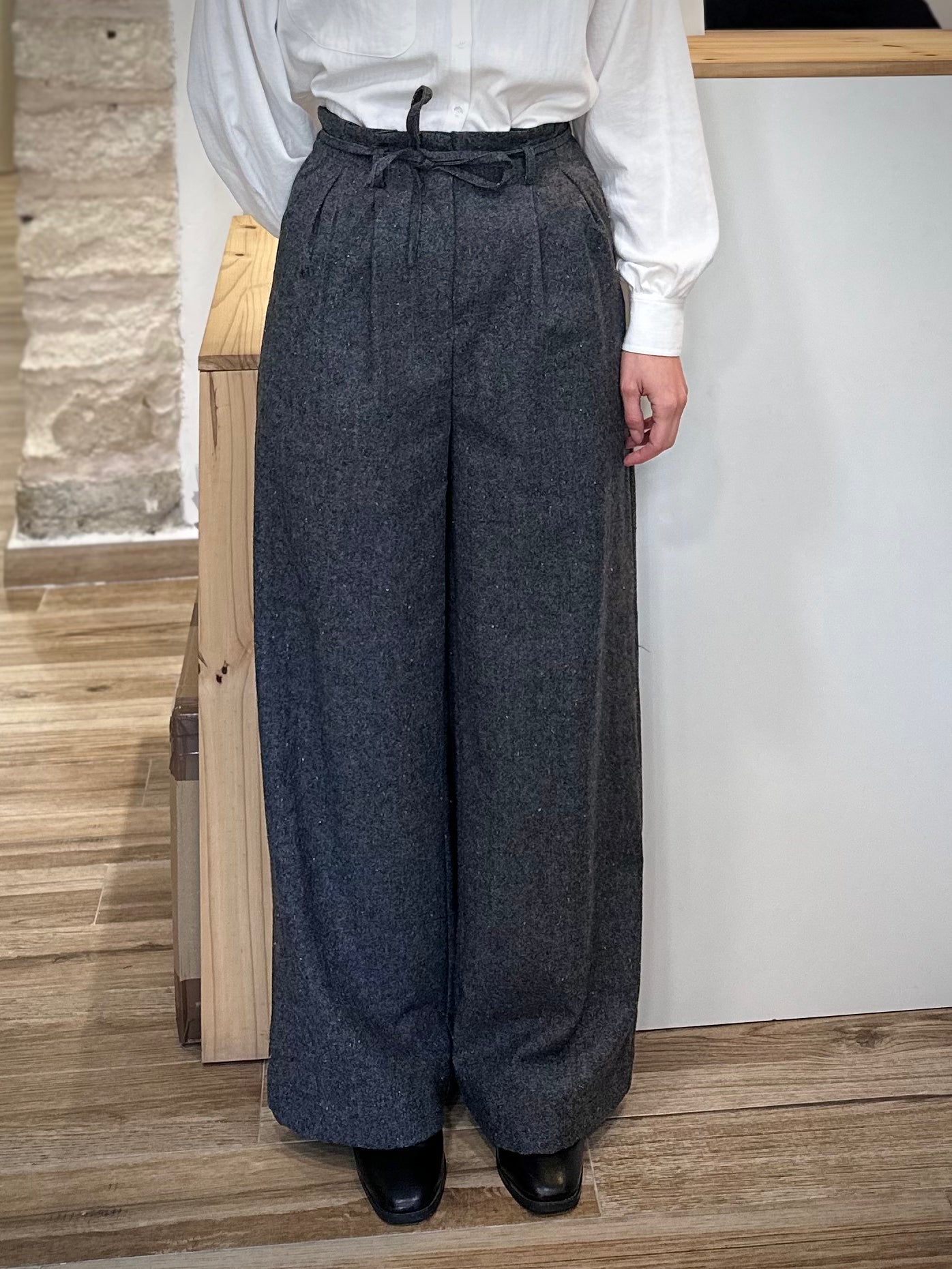 Le pantalon Plume est confectionné dans une laine souple qui offre structure et mouvement à la fois : un équilibre rare et parfaitement maîtrisé. Sa coupe évasée allonge la silhouette, tandis que la taille se souligne d’un lien à nouer pour apporter définition et finesse. Les plis à l’avant, les pinces au dos et les poches italiennes ajoutent une touche tailoring raffinée. Entièrement doublé, il reste doux sur la peau, assurant un confort optimal tout au long de la journée. Le gris, profond et lumineux, apporte cette neutralité chic qui s’accorde à toutes les envies.