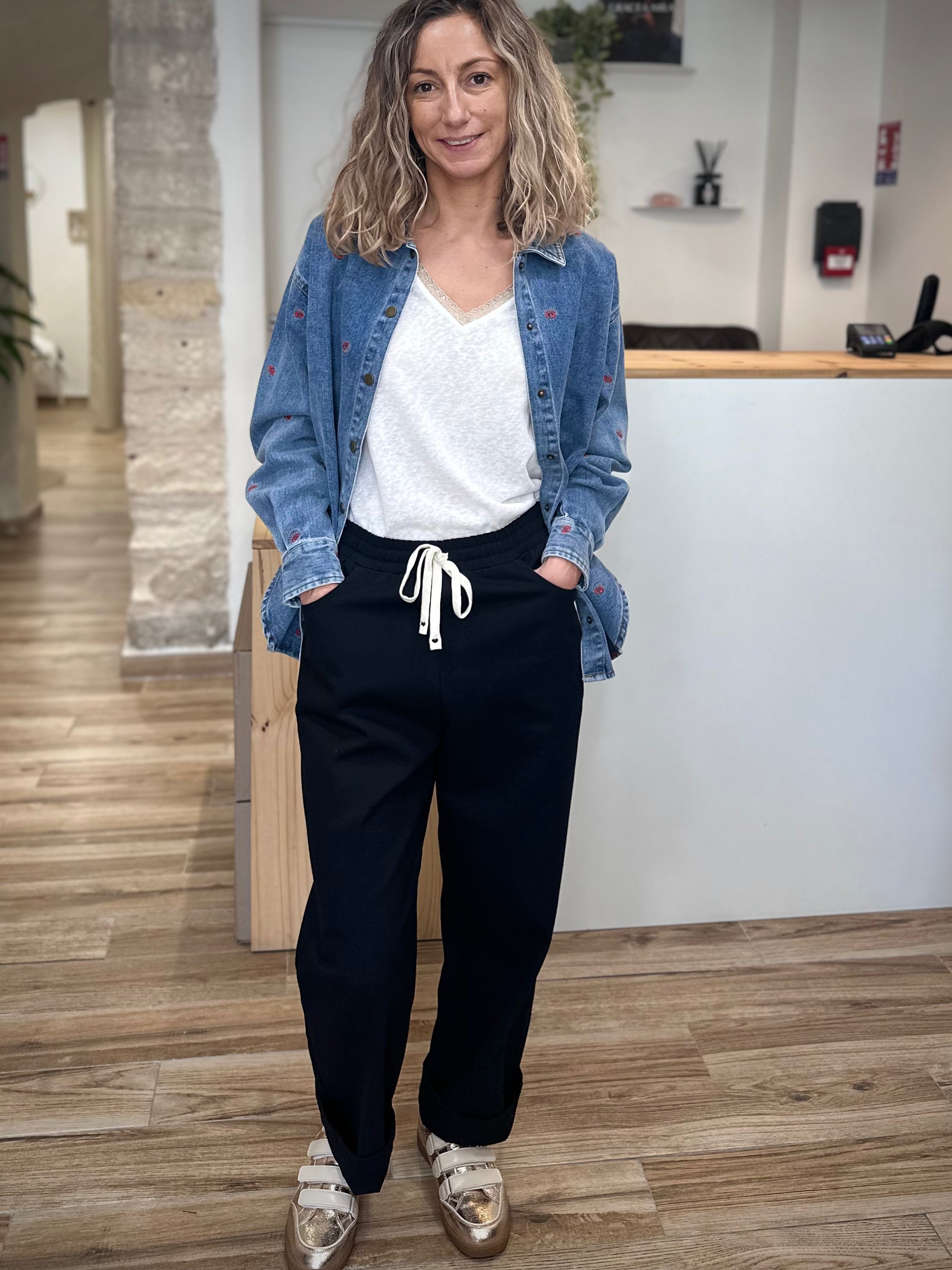 Ce pantalon est le compagnon idéal des quotidiens actifs comme des instants détente. Portez-le avec un pull douillet pour vos sorties d’automne ou un top près du corps pour un look plus affirmé. Sa coupe fluide s’adapte à toutes les morphologies, et son noir profond en fait une base polyvalente, facile à associer à vos pièces favorites.