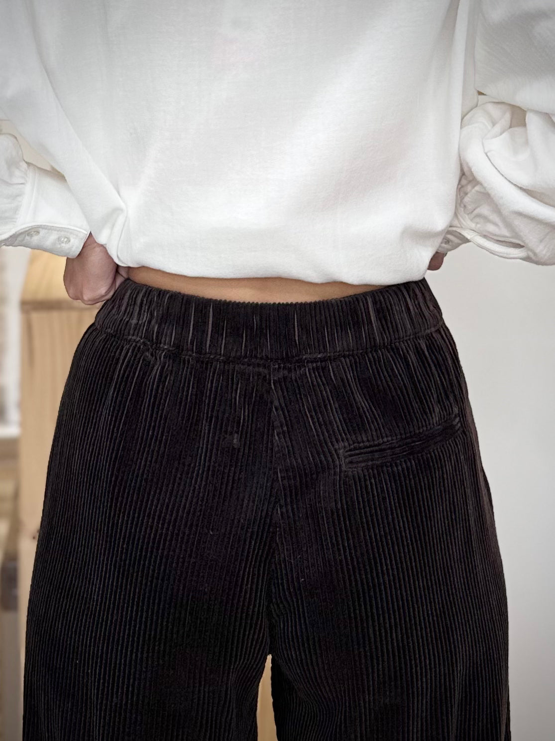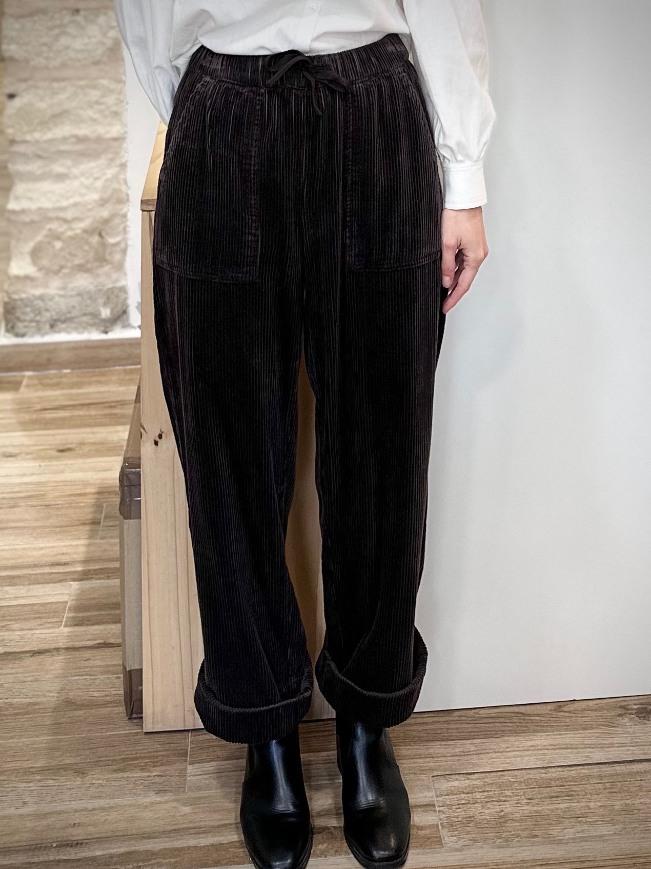 Confectionné en 100% coton, ce pantalon en velours côtelé offre une texture riche et confortable, idéale pour la saison froide. Sa taille élastiquée avec lien de serrage assure un ajustement souple et flatteur. Les grandes poches avant, visibles et graphiques, apportent une note moderne et pratique. Sa coupe légèrement ample, avec bas roulotté ou droit selon vos envies, crée une allure contemporaine et décontractée.