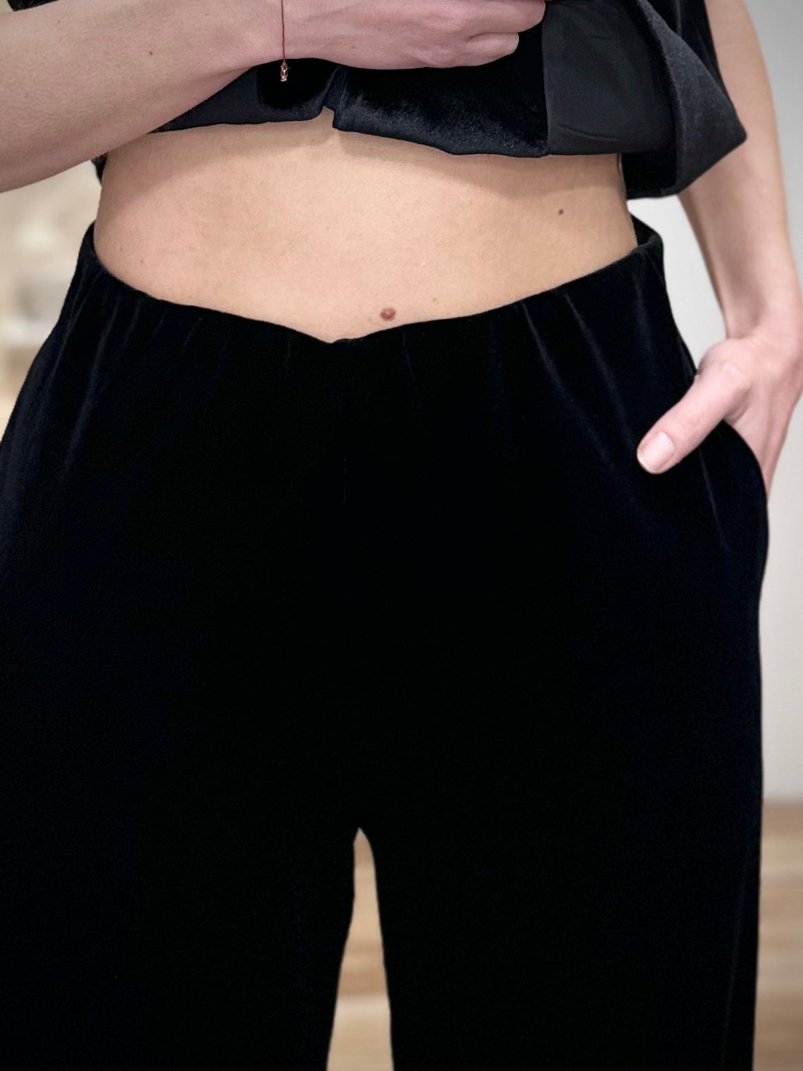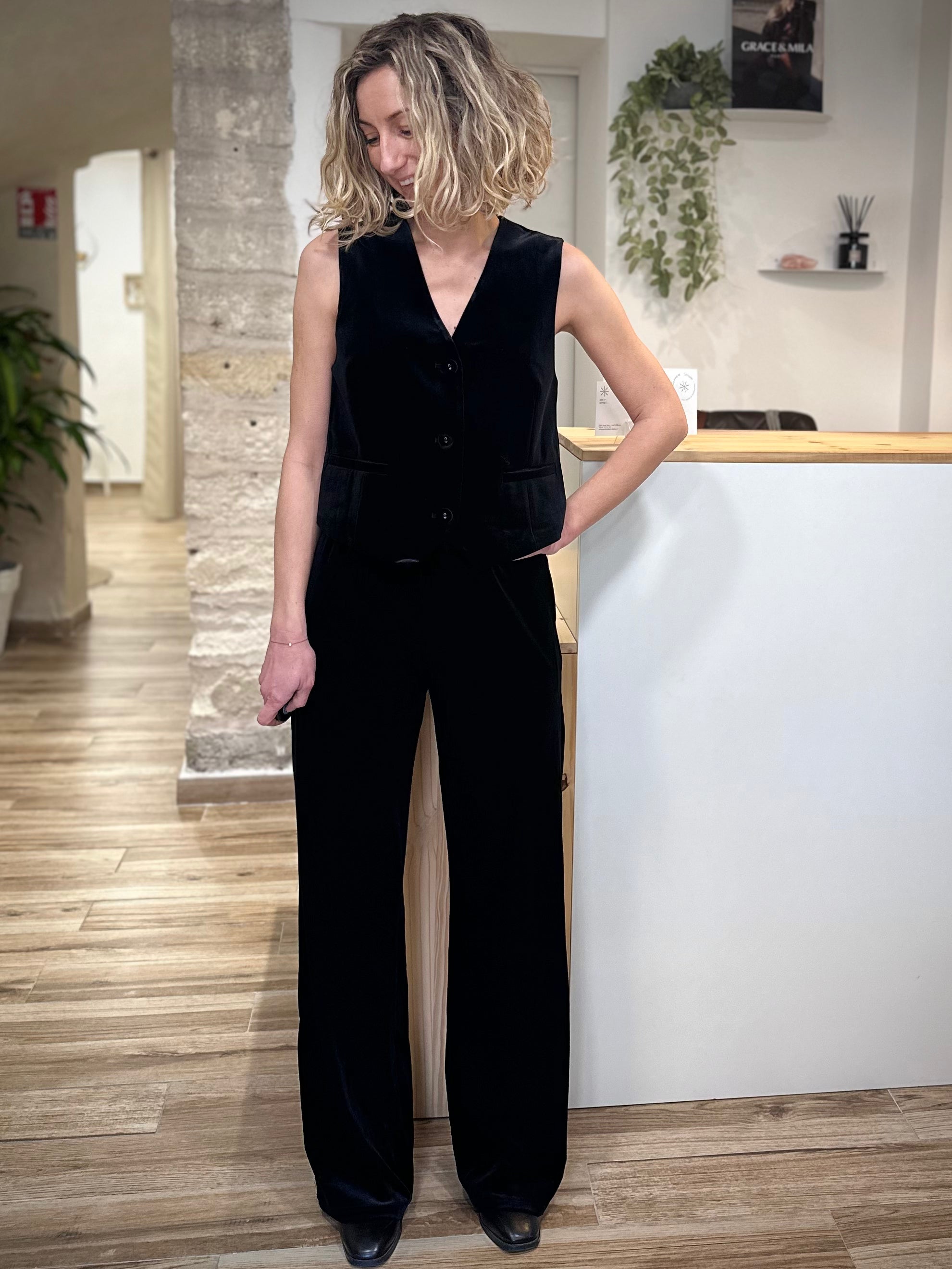 Confectionné dans un velours doux et légèrement extensible, le pantalon TIGER épouse délicatement vos courbes grâce à sa taille haute et à sa coupe droite. Les poches discrètes dans les coutures latérales et les poches passepoilées au dos apportent fonctionnalité et raffinement. Sa teinte noir profond confère une allure chic et polyvalente, idéale pour les associations casual chic ou pour créer un style plus affirmé avec des pièces structurées comme le gilet de costume TOTEM.