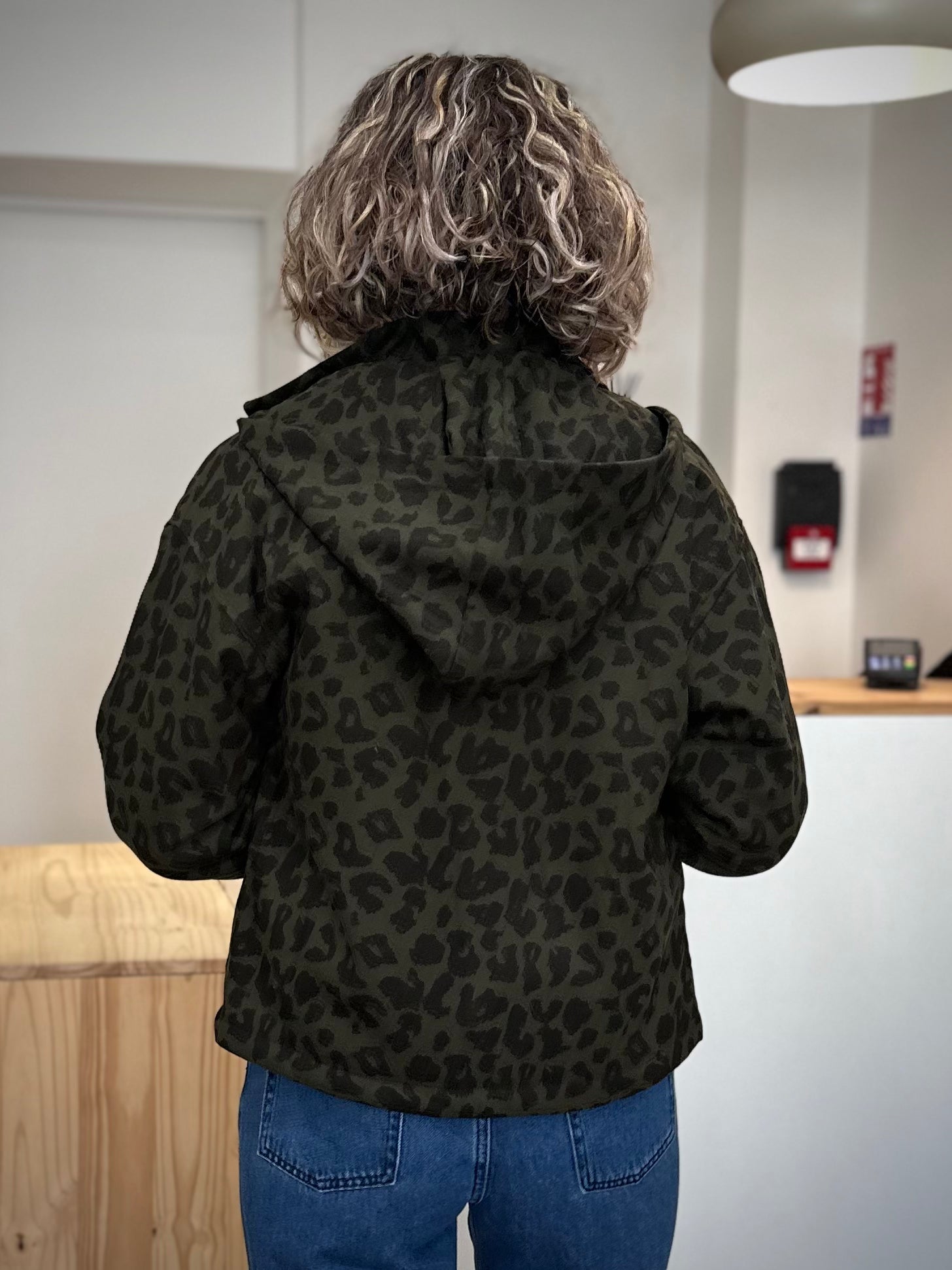 - Détails : imprimé léopard kaki, poches XXL à rabats, cordon de serrage à la taille et à la capuche