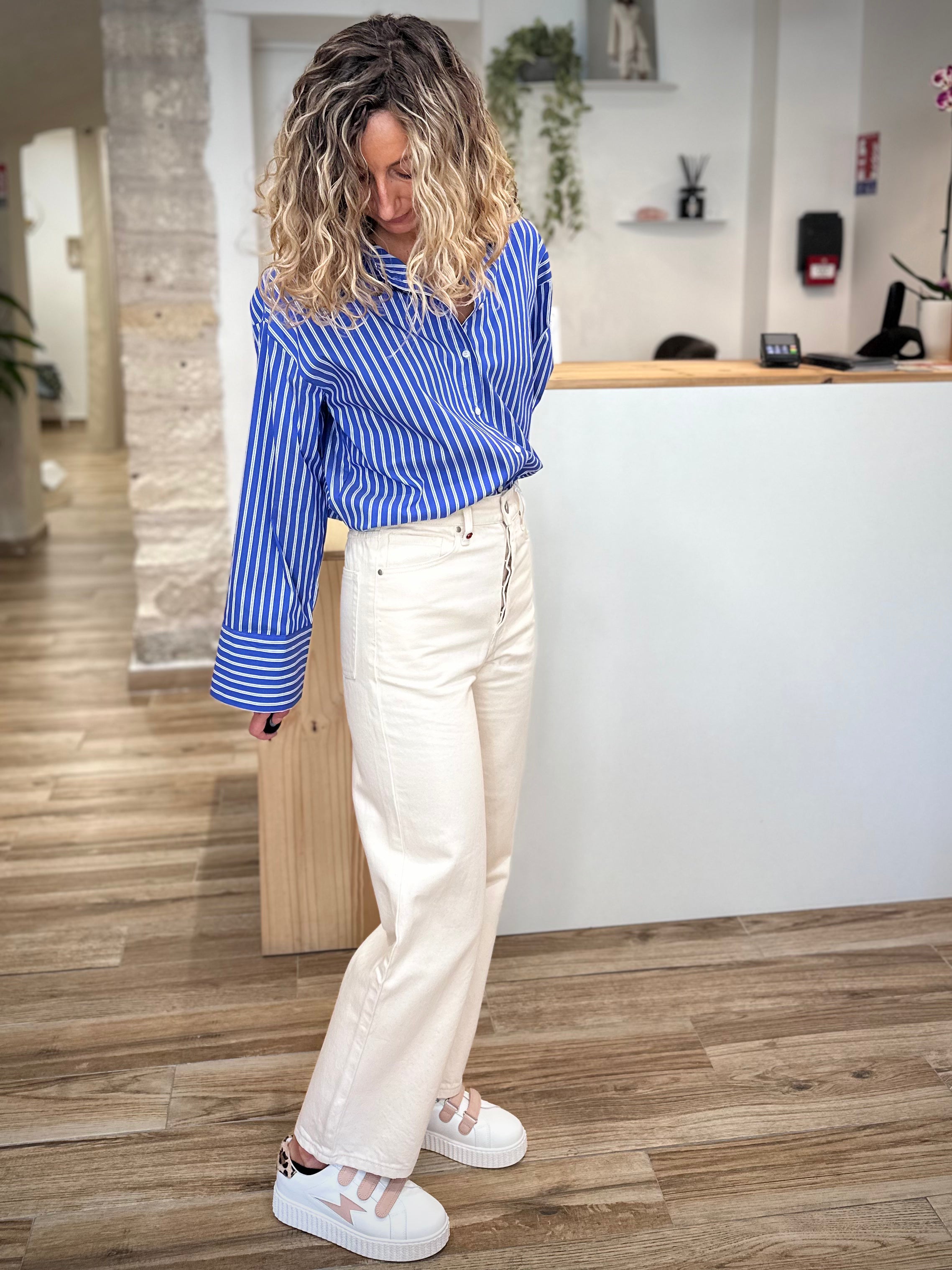 Confectionné en 100 % coton, le jean POLA allie authenticité et confort. Sa taille haute structure la silhouette, tandis que sa coupe droite met en valeur toutes les morphologies. La longueur cropped 7/8e dévoile subtilement la cheville, parfaite pour jouer avec des bottines, des mocassins ou des baskets. Son fermoir boutonné et ses passants de ceinture apportent une touche classique, pensée pour durer.