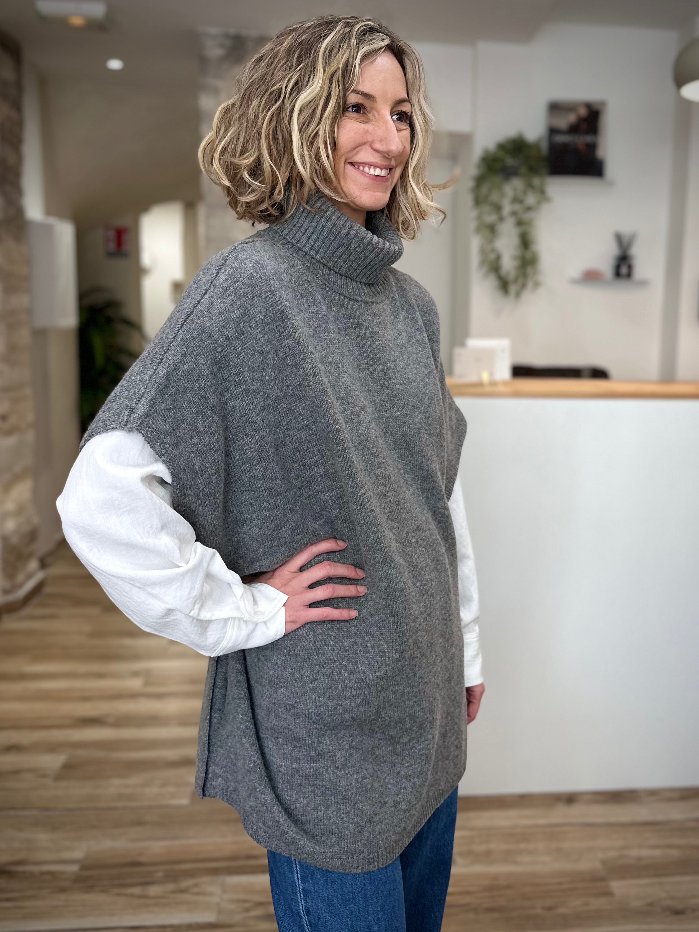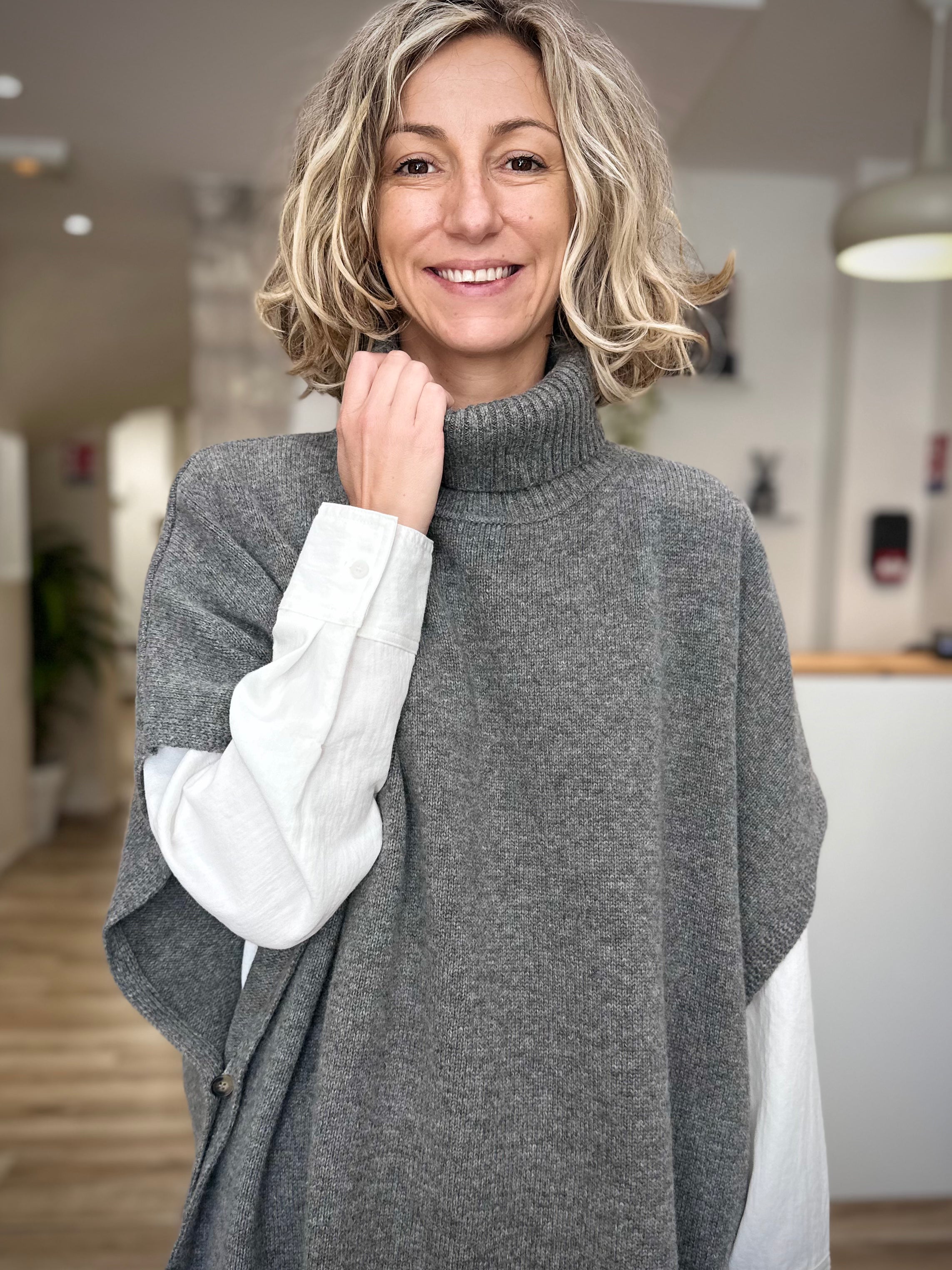 - Longueur / style : poncho col roulé, style cocooning chic