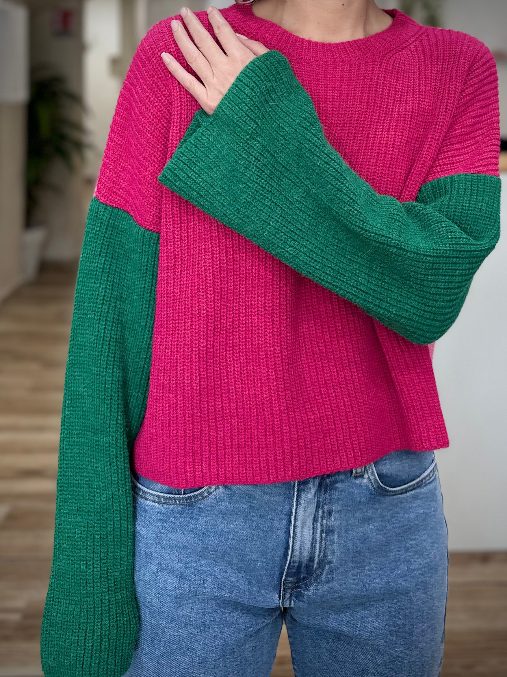 Ce pull est réalisé dans un mélange précieux de 75% polyamide, 10% laine, 10% viscose et 5% alpaga, assurant douceur, chaleur et tenue impeccable dans le temps. Sa coupe oversize, ses épaules tombantes et ses manches longues légèrement évasées créent un volume élégant et décontracté. Le jeu de blocs de couleurs – rose vif, rose tendre et vert profond – apporte un effet graphique et vitaminé, idéal pour réveiller un jean brut ou un pantalon clair.