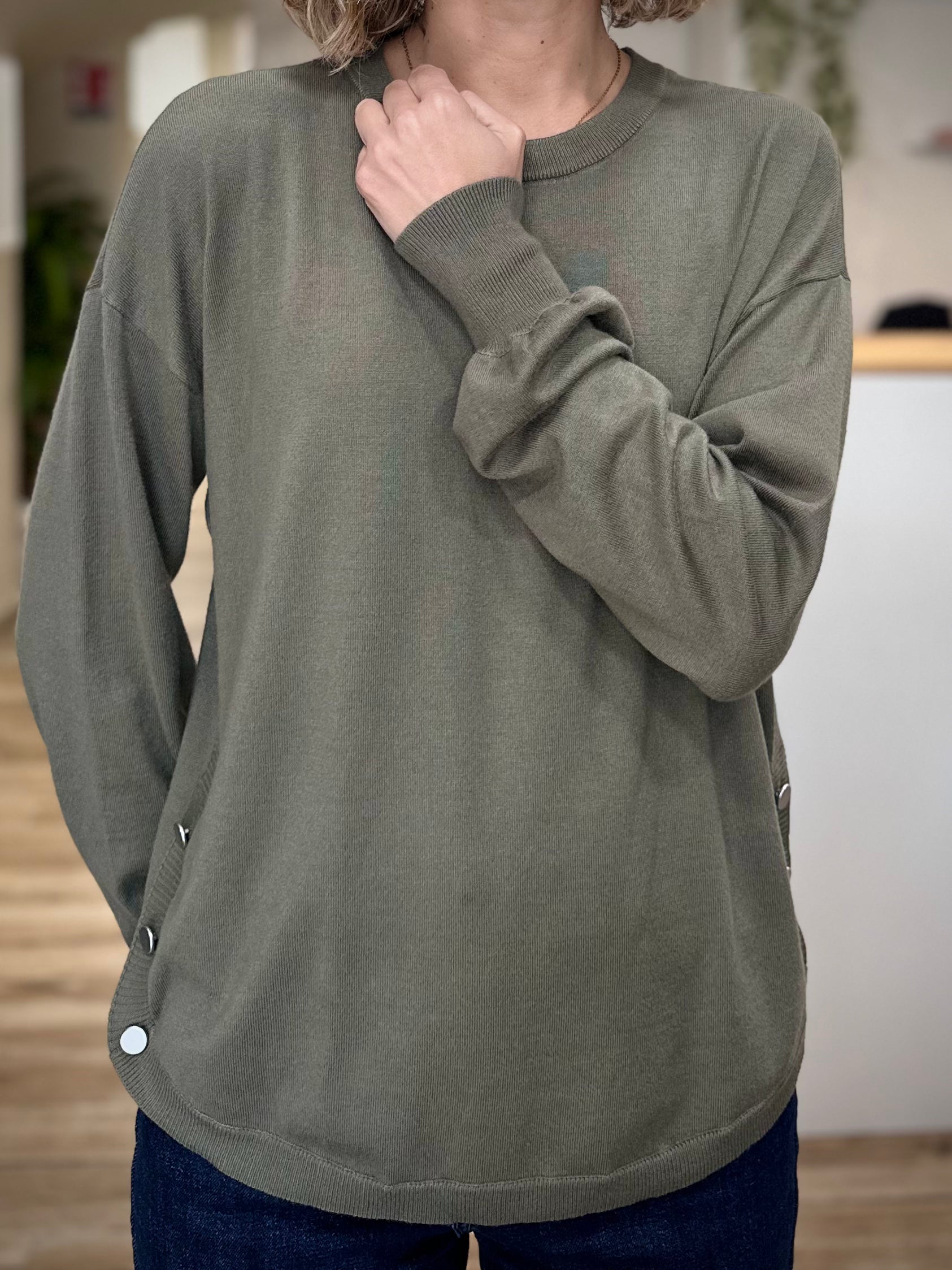 Confectionné dans une matière tricotée légère, ce pull offre un tombé souple et agréable sur la peau. Sa coupe droite épouse délicatement la silhouette sans la contraindre, tandis que la longueur aux hanches assure un porté équilibré. Les boutons sur le côté ajoutent une touche discrète d’originalité et de modernité.