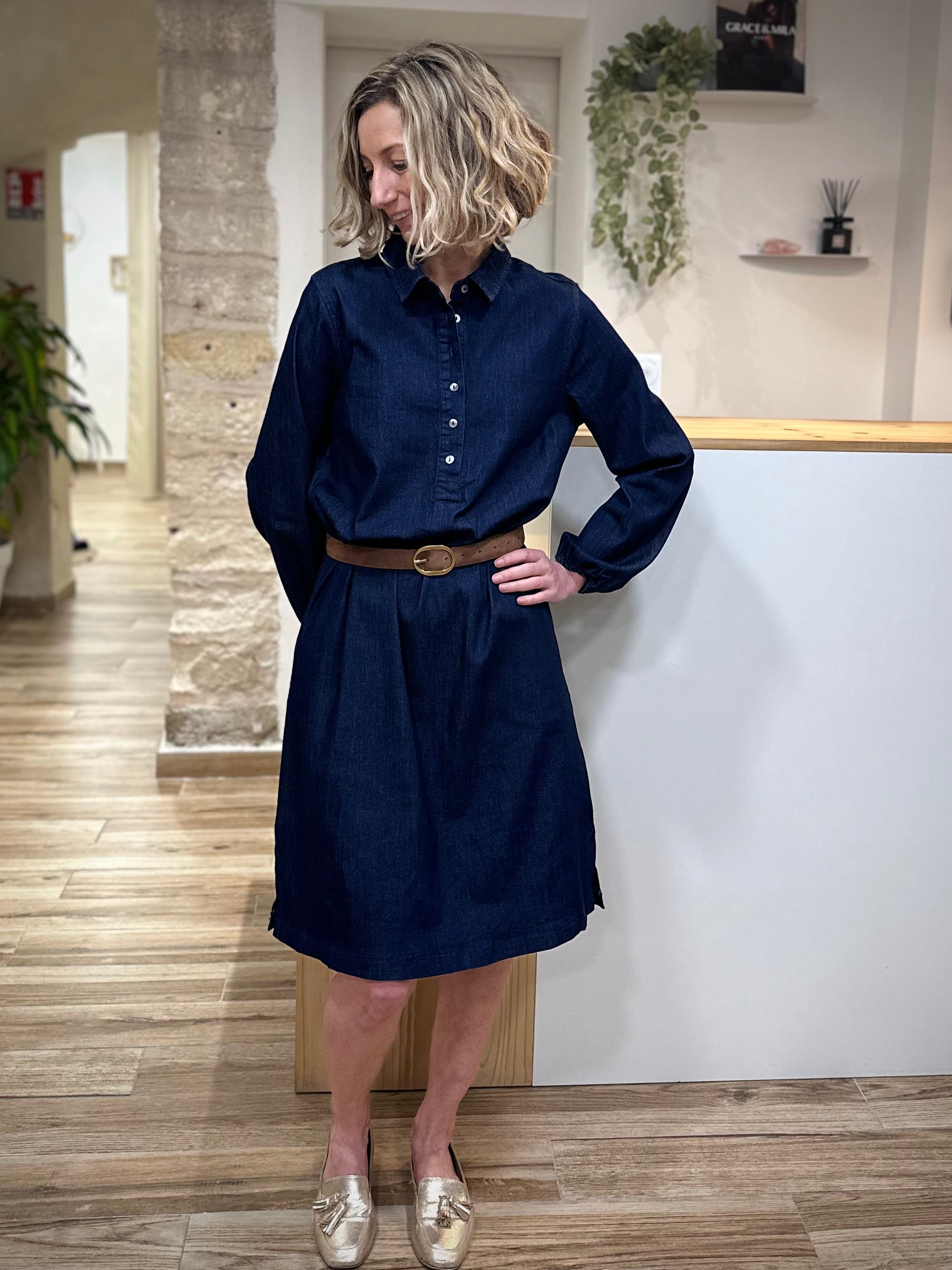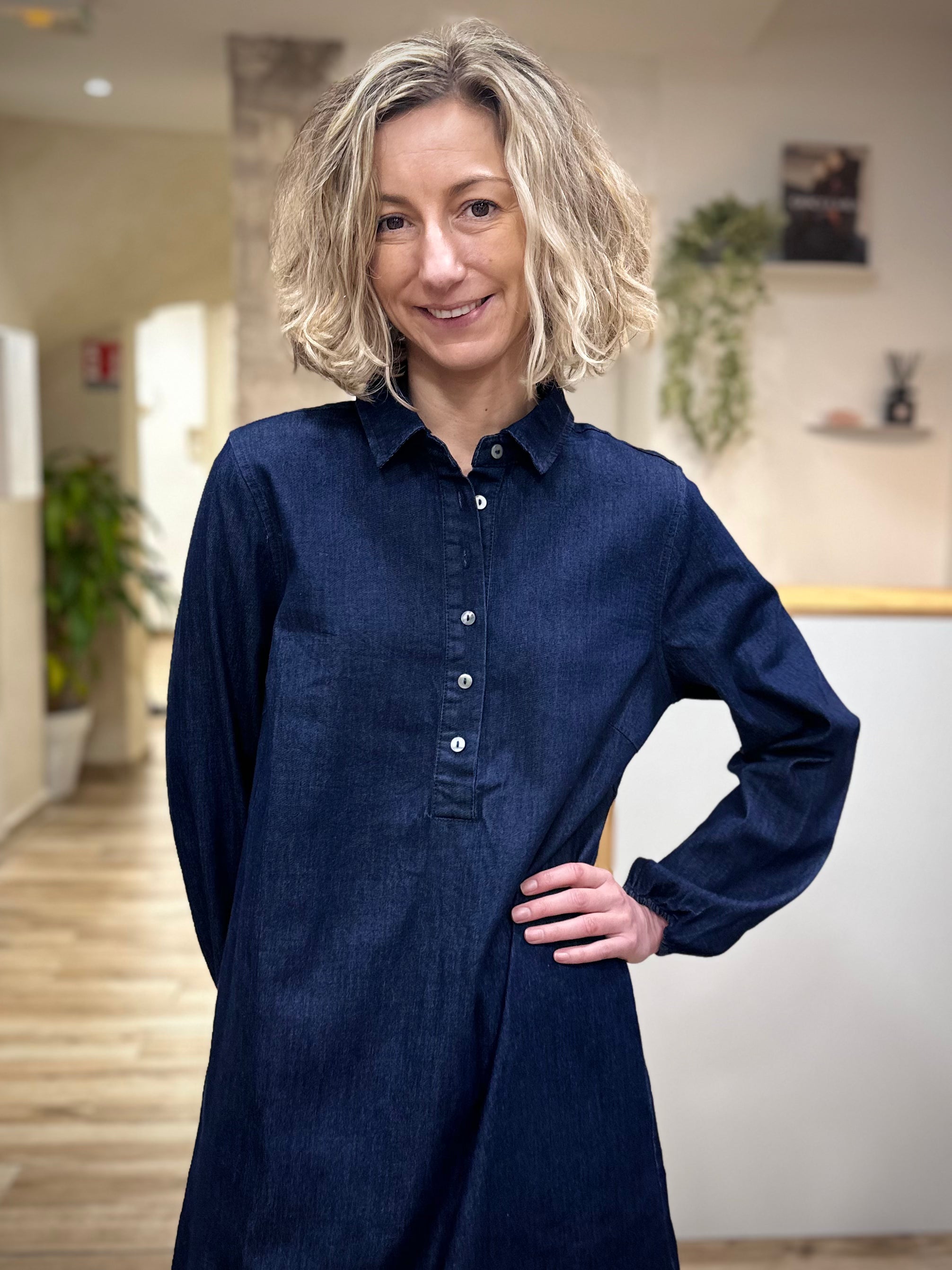 Confectionnée majoritairement en coton, la robe CHICAGO offre un toucher doux et un tombé naturel. Sa coupe ample assure une silhouette décontractée et moderne, tandis que sa longueur sous le genou apporte une élégance facile à porter au quotidien. Son coloris indigo, profond et intemporel, sublime toutes les carnations. On aime ses manches longues légèrement resserrées aux poignets, son col chemise structuré et sa patte de boutonnage discrète qui rappelle l’esprit du denim revisité.