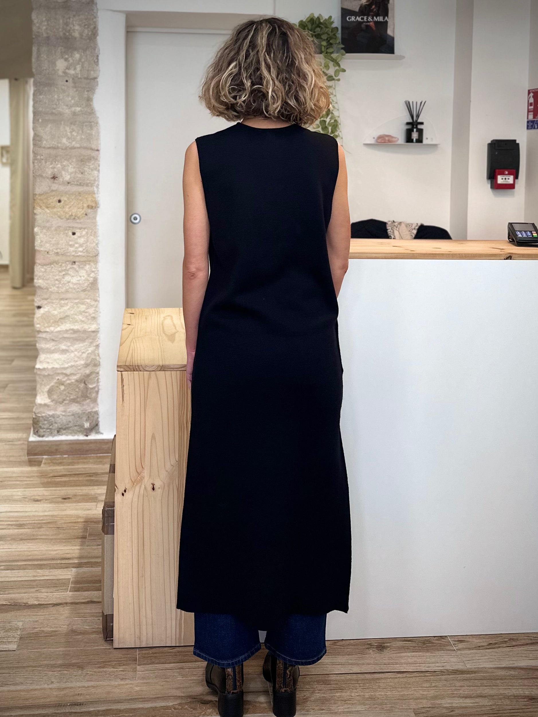 Son design asymétrique attire le regard : une patte de boutonnage contrastée sur le côté droit, ornée de gros boutons effet corne, vient souligner la silhouette avec raffinement. La fente latérale unique, légèrement audacieuse, apporte une touche de mouvement et de féminité. La teinte noire profonde, à la fois intemporelle et graphique, s’associe facilement à vos basiques comme à vos pièces plus fortes.