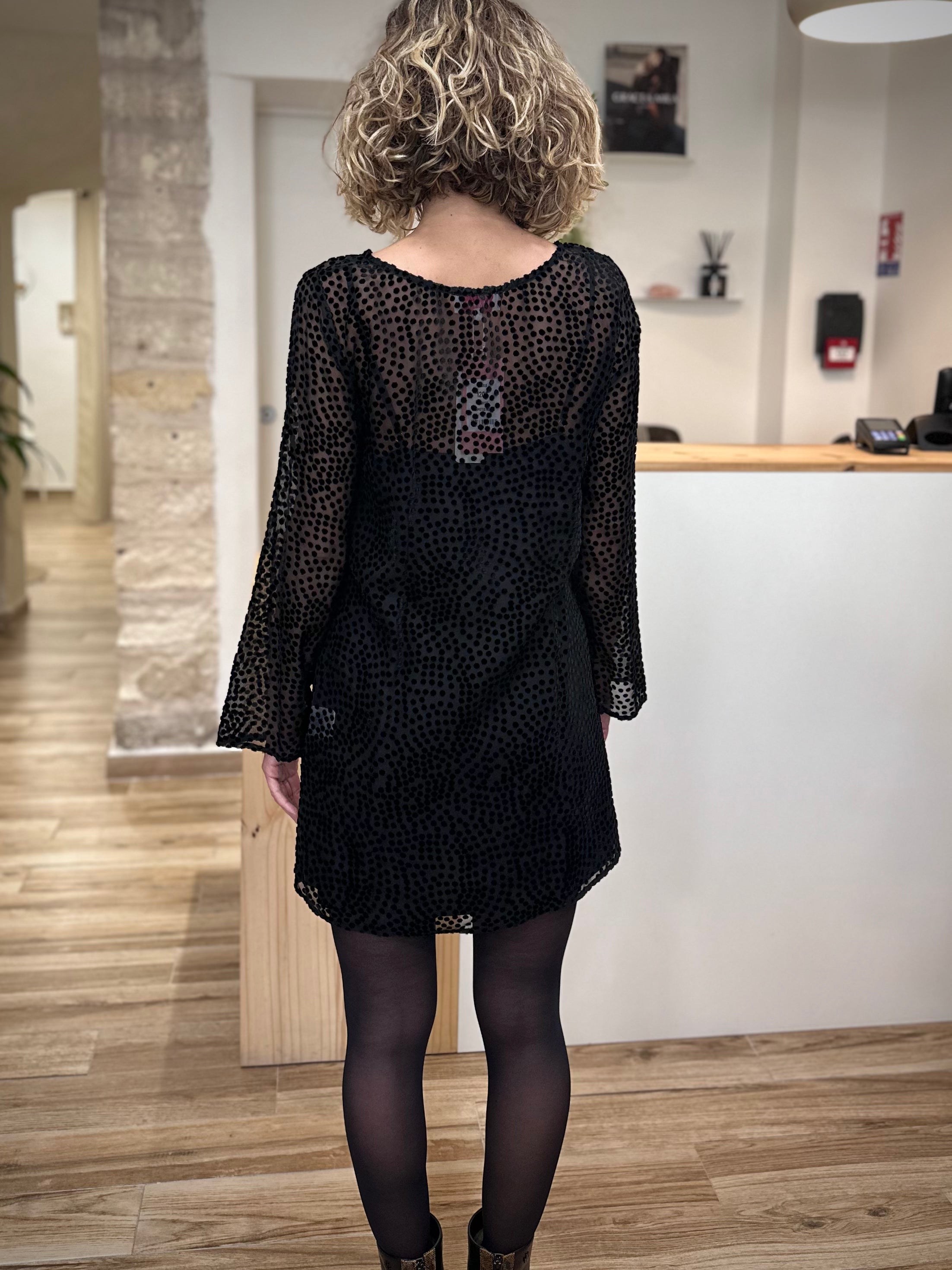 - Détails : Motif plumetis en velours, transparence subtile, zip invisible sur le côté