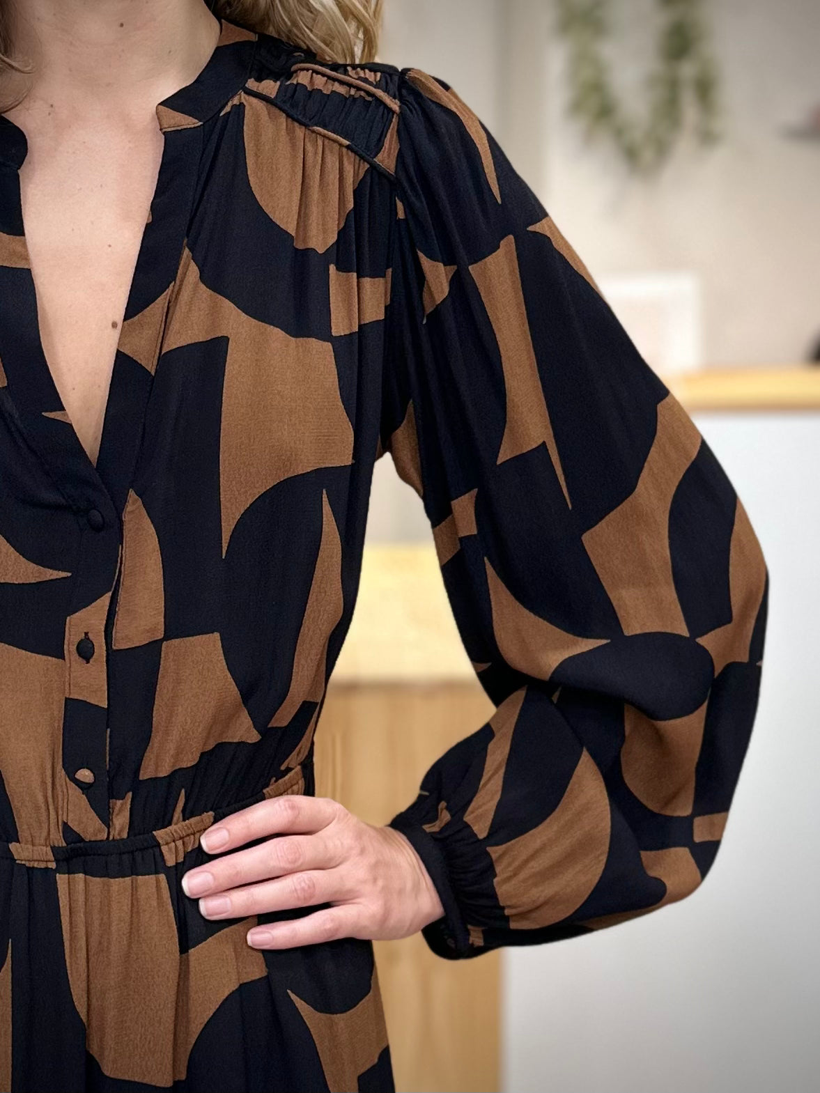 - Détails : imprimé géométrique bicolore chocolat & noir, encolure ronde fendue en V, ouverture boutonnée, poignets resserrés, fronces aux épaules et dos, biais insérés