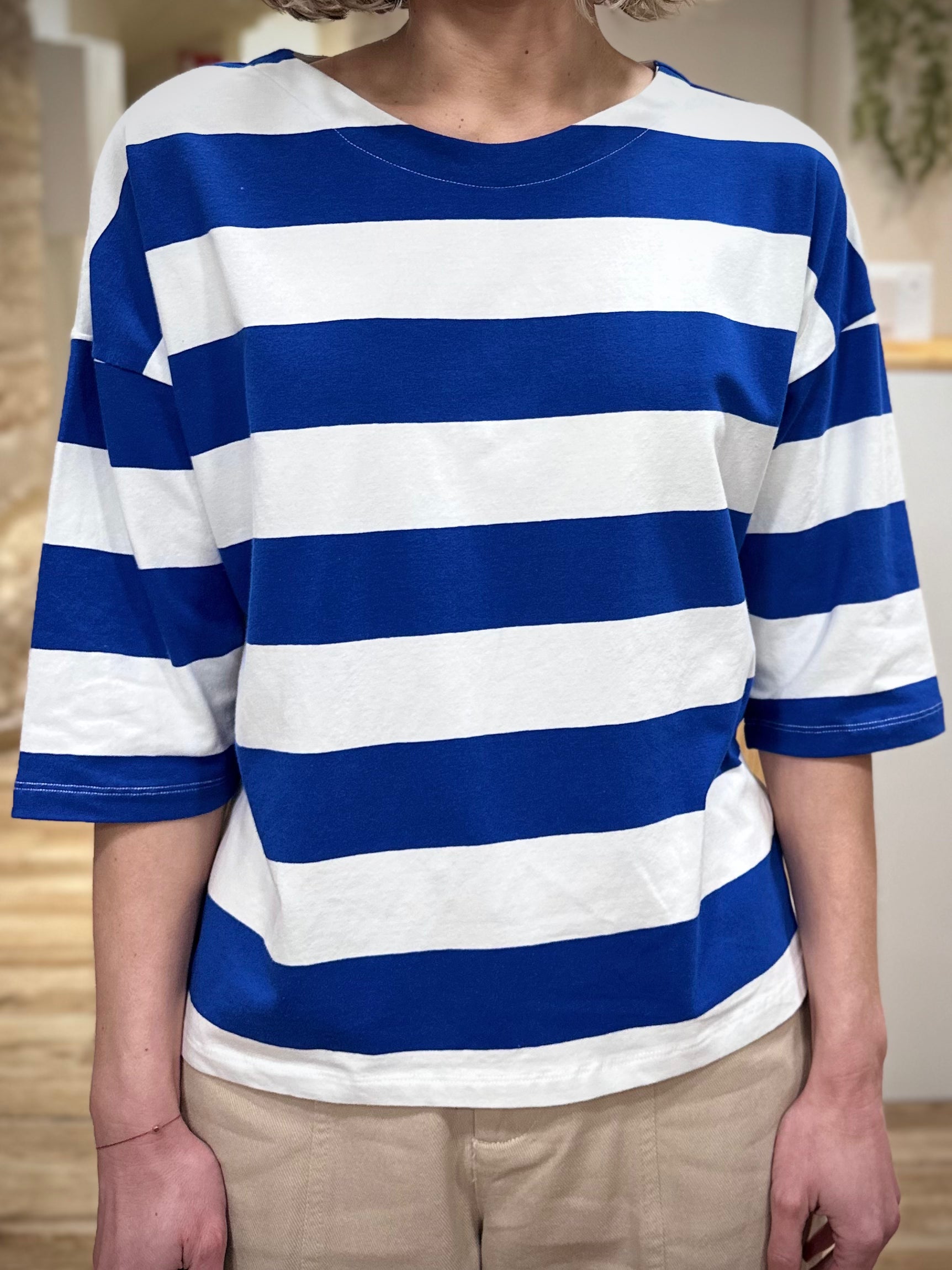 Confectionné dans un coton majoritaire enrichi d’élasthanne, le tee-shirt SIVA offre une matière douce, respirante et agréable sur la peau. Sa coupe ample structurée apporte une silhouette moderne tout en conservant une belle tenue. Sa longueur régulière équilibre les volumes avec justesse. Les rayures blanches et bleues, graphiques et lumineuses, évoquent un esprit bord de mer revisité avec élégance. Les manches 3/4 soulignent l’allure casual chic, idéales pour la mi-saison.