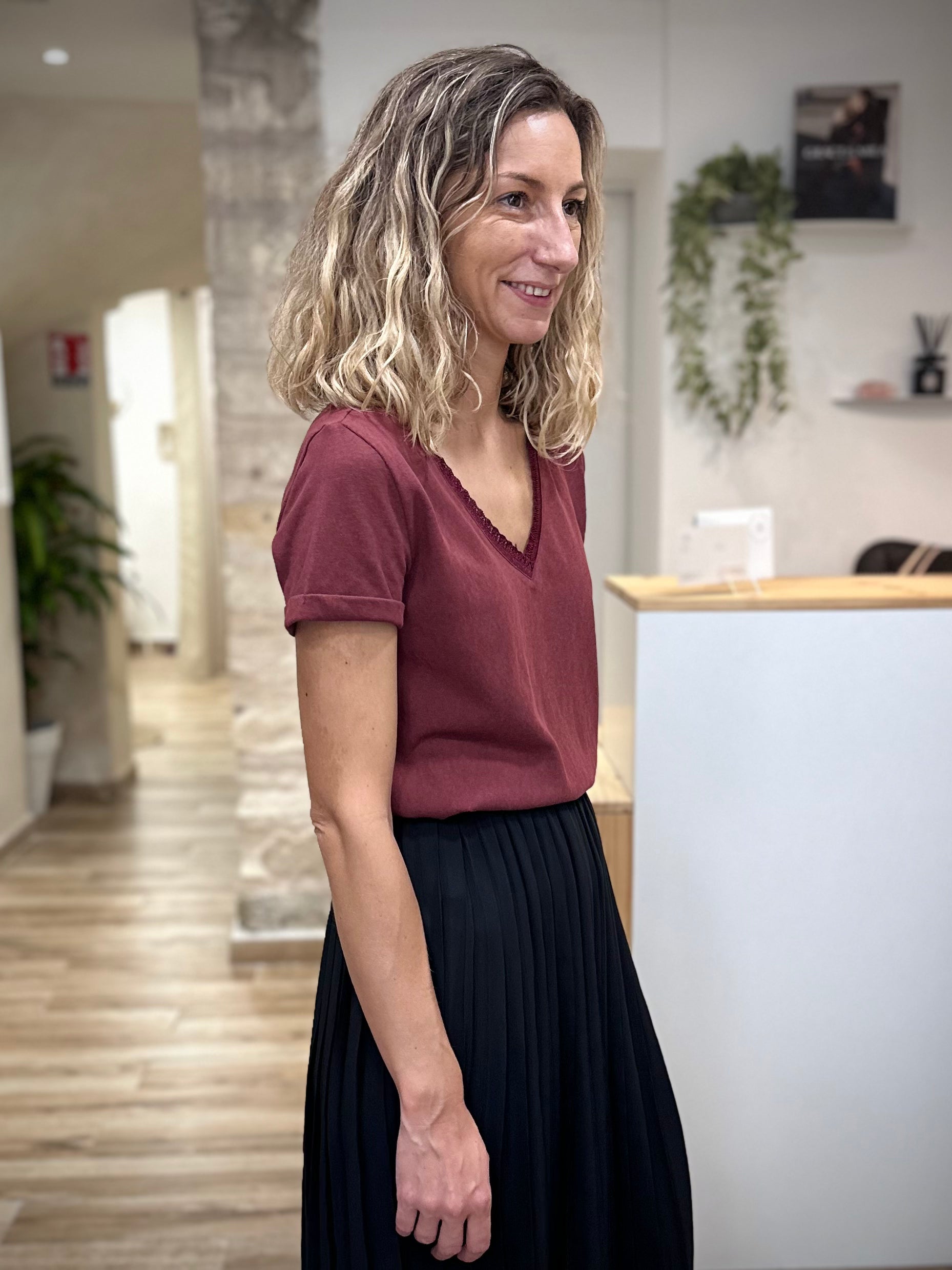 Confectionné en fibres naturelles (80% coton, 20% polyester), il allie douceur et tenue impeccable. Sa coupe droite s’adapte à toutes les morphologies et ses manches courtes, finies par un ourlet discret, structurent la silhouette avec simplicité. Le coloris bordeaux, profond et chaleureux, se prête parfaitement à la saison, relevé par le liseré scintillant qui souligne le décolleté et transforme ce basique en pièce élégante.