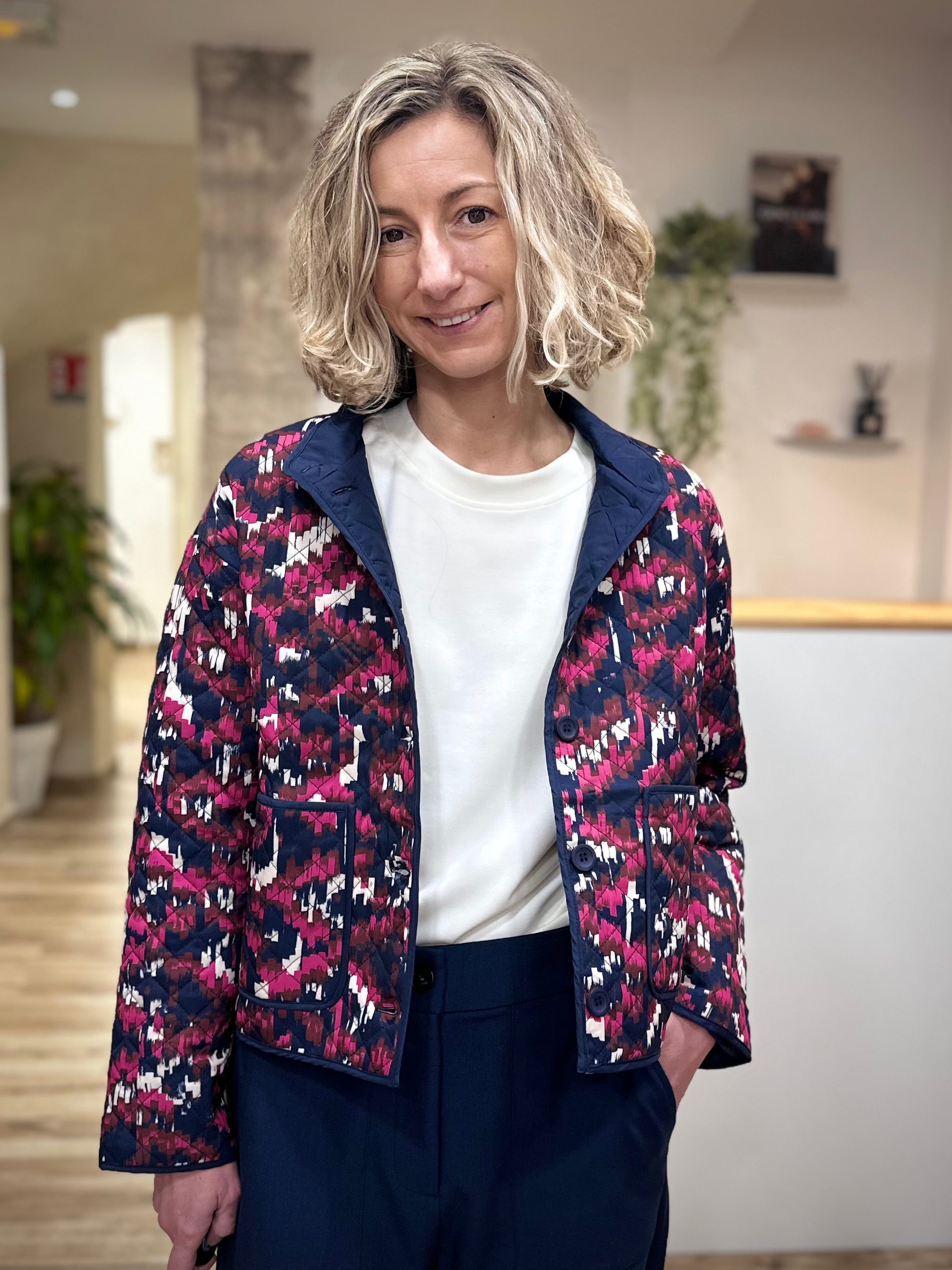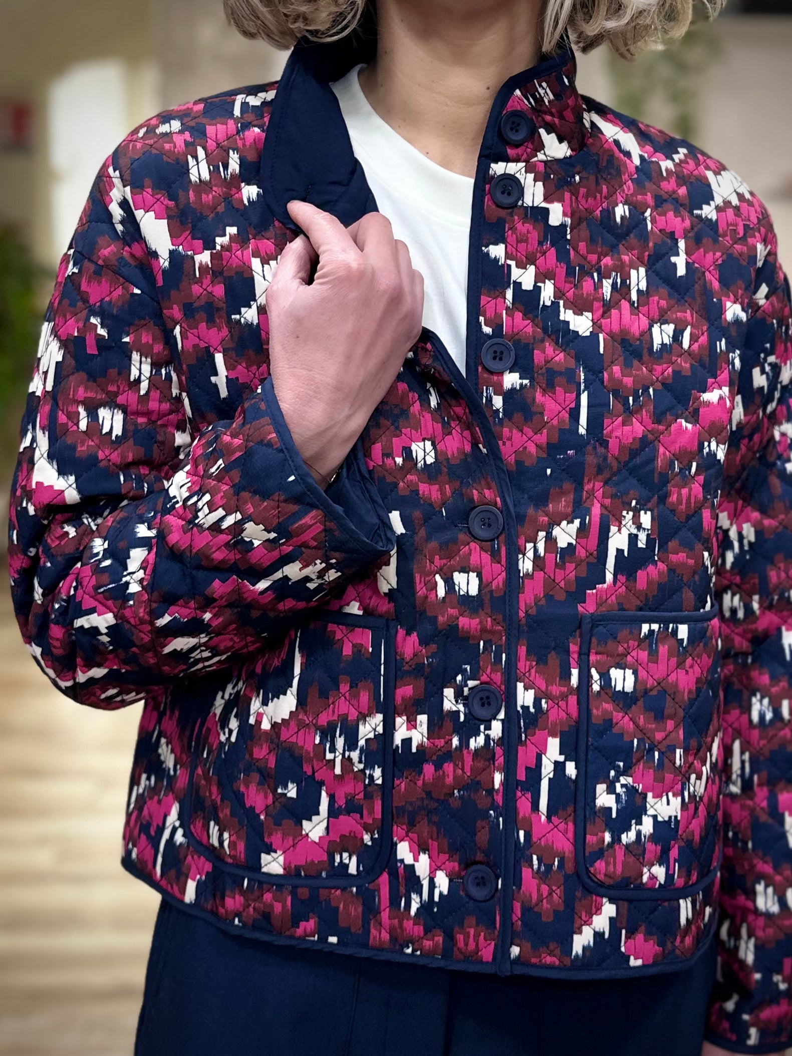 Avec son imprimé géométrique aux nuances profondes de rose, de marine et de touches claires, la veste Claudine affirme un style graphique et artistique tout en restant facile à associer. Sa coupe droite confortable, sa longueur hanches et ses manches longues offrent une silhouette structurée sans rigidité. Les boutons sur le devant, les poches plaquées et les finitions soignées renforcent son allure casual chic, pensée pour le quotidien.